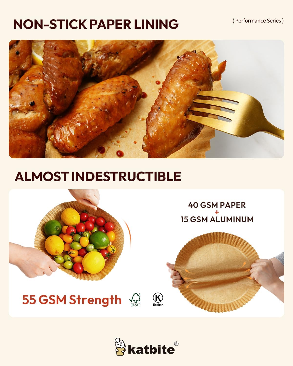 - Upgraded Heat and Conductivity: Katbite Paper & Aluminum Foil Air Fryer Liners feature a 2-layer construction with 40GSM parchment paper and 15GSM high-quality aluminum foil. Compared to regular liners, they offer superior non-stick properties and enhanced oil resistance. Capable of withstanding temperatures up to 600°C, our liners provide excellent thermal conductivity, resulting in faster and more even cooking while also crisping food more effectively.