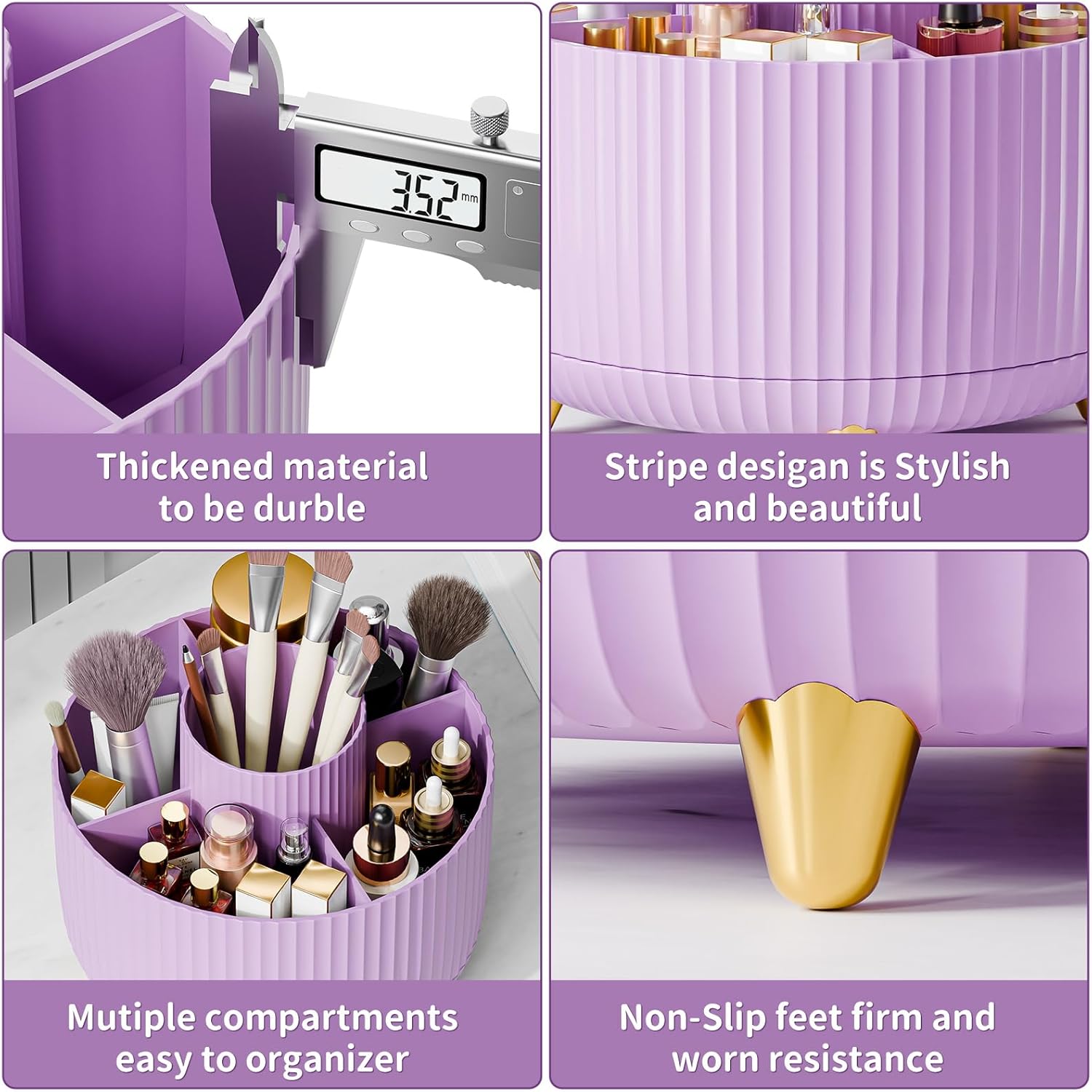 - 【STYLISH & GENEROUS】The classic look makeup brush holder organizer feature fashionable vertical stripes design and gold-plated feet to protect the desktop from wear, must be a beautiful and fashionable presence on your vanity.