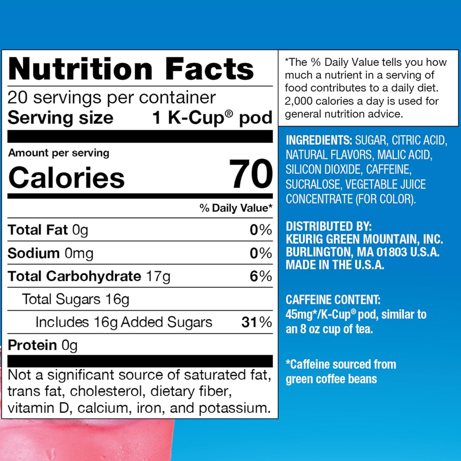 - Nutritional facts: One K-cup pod contains 70 calories of which total Fats 0g (0%), Sodium 0g (0%), total Carbohydrates 17g (6%) includes 16g of added Sugar (31%), Protein 0g (0%)