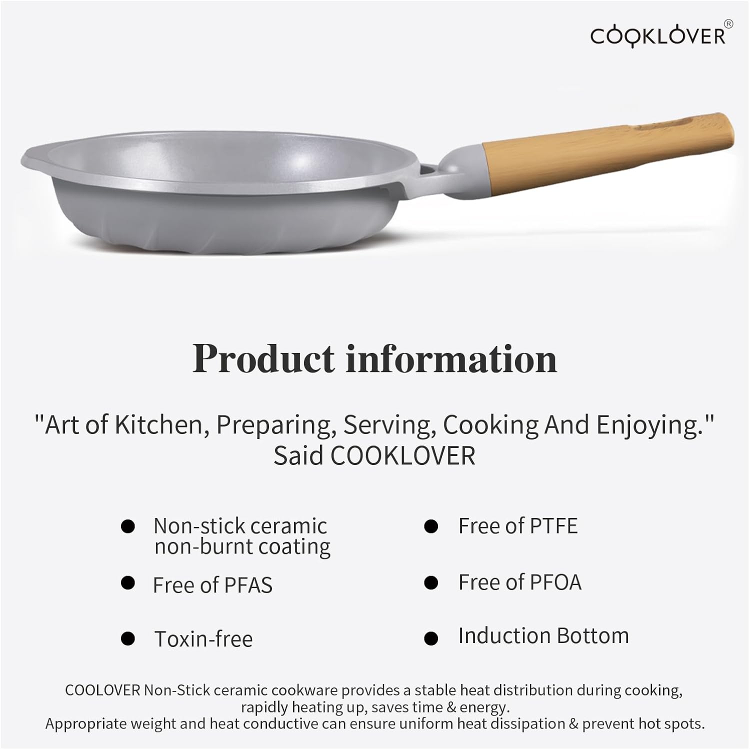 - ✅Ergonomic Bakelite handle: COOKLOVER's fry pan builds with Eye-catching heat resistant soft touch silicone robust Bakelite handle with beautiful wood grain design. Stay cool and comfortable. Easy to maneuver, Safe & Anti-scald. Do not put this handle directly on the fire or do not heat it for a long time.
