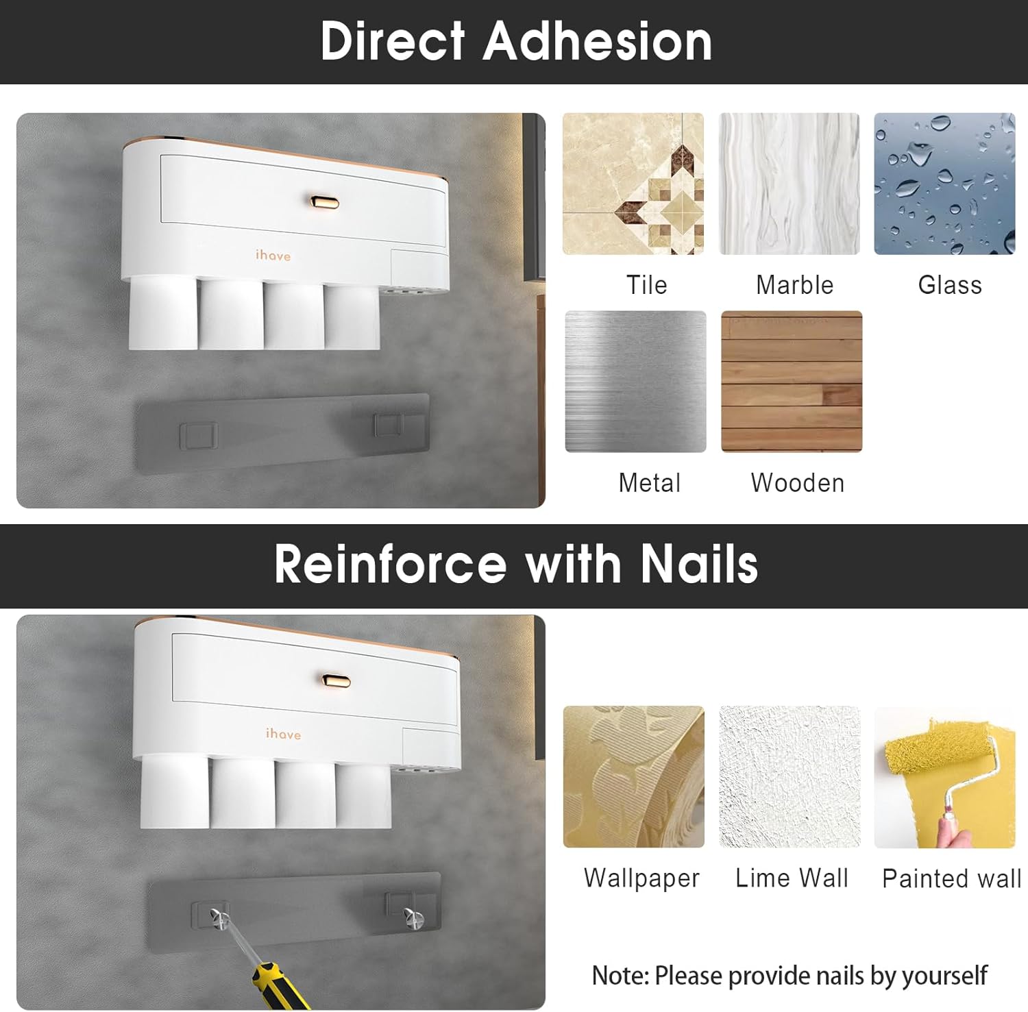 - Sturdy: The toothbrush organizer use a non-marking adhesive strip with an excellent caulking effect, ensuring a secure and tight bond even in humid environments. Whether your walls are made of metal, wood, mirror, ceramic tile, or marble, our wall mount toothbrush holder will stay in place. In case of uneven, painted, or wallpapered walls, we also provide nails for additional reinforcement, making it a versatile solution for any home.