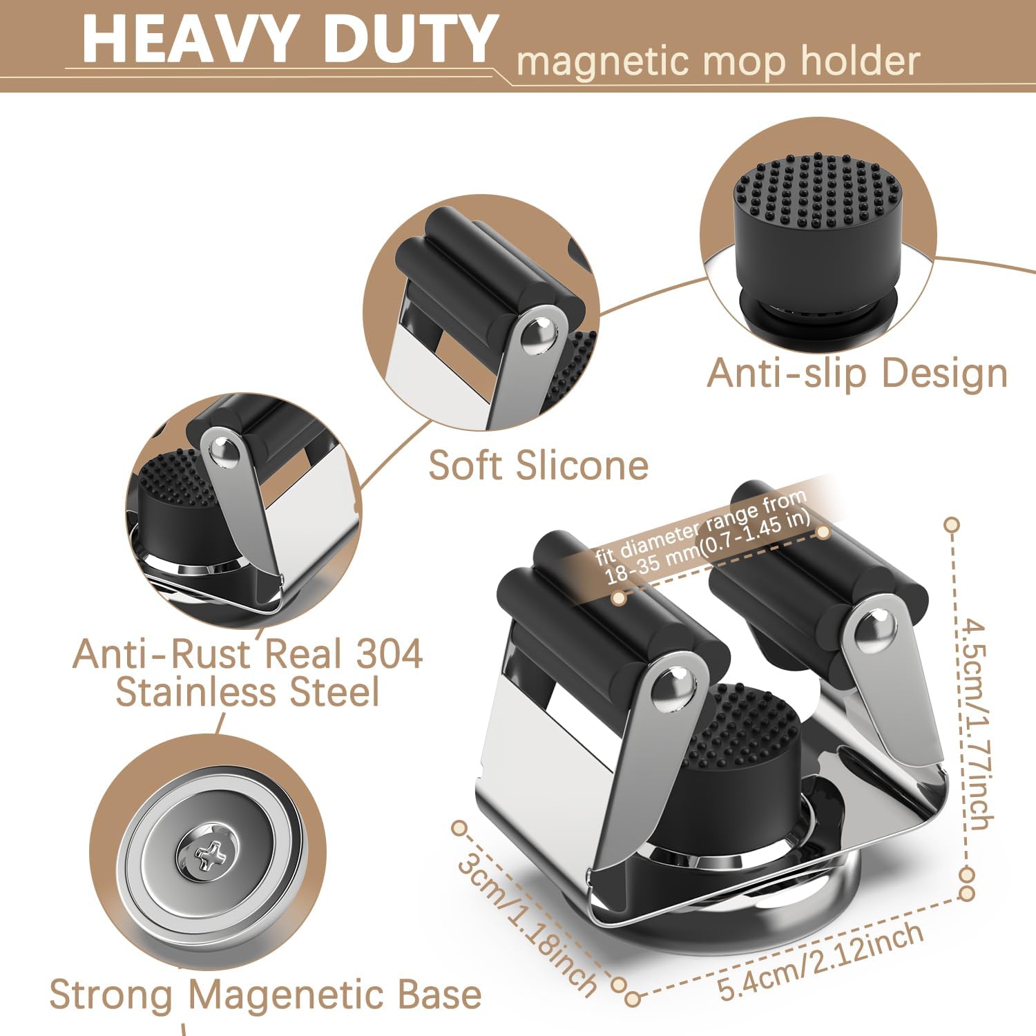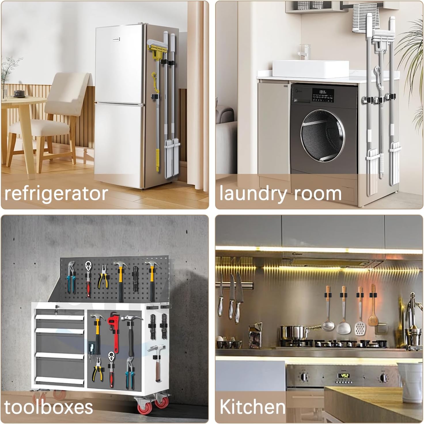 - ๐งฒ[EASY TO INSTALL] Without drilling holes, the magnetic broom holder can attach to any metallic surface to secure mops, brooms, flashlights, spray cans, markers, and other small garage tools in place, and easily move it around when using, much handy for daily life.