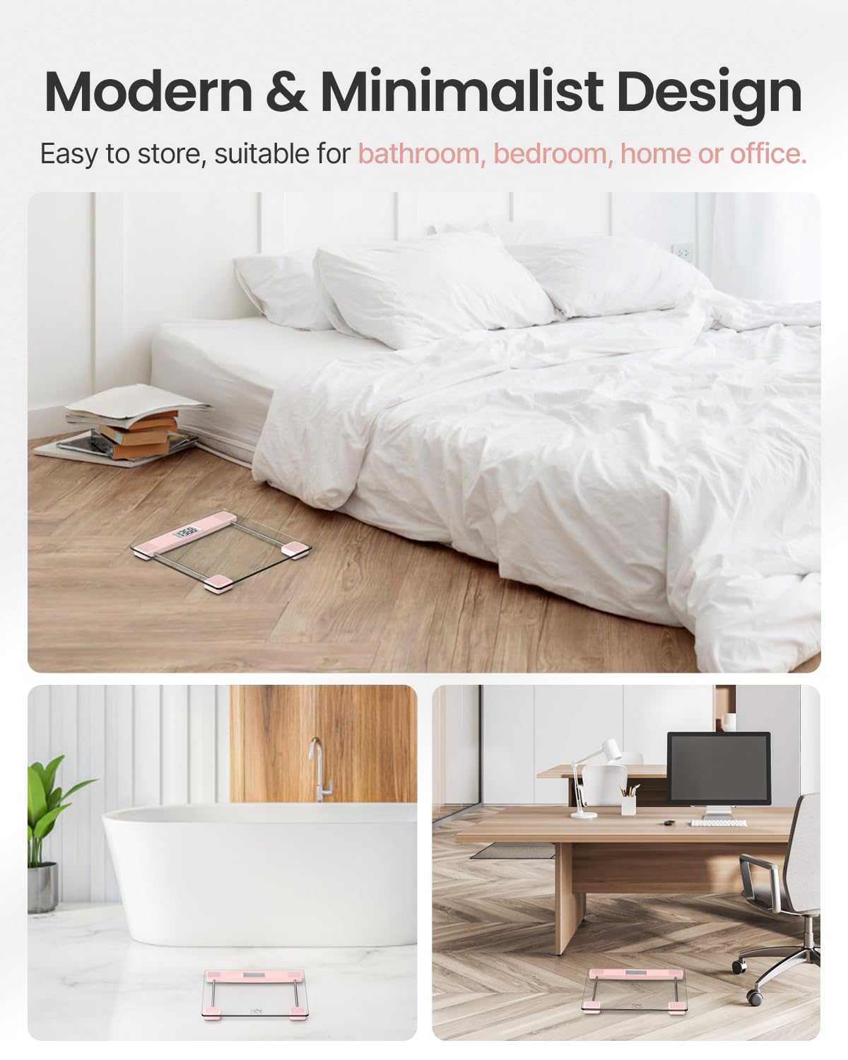 - [Modern & Sleek Design] Crafted from 5 mm tempered glass with rounded edges and anti-skid pads, the scale enhances stability and safety while ensuring easy cleaning. Its minimalist design blends seamlessly with any home decor.
