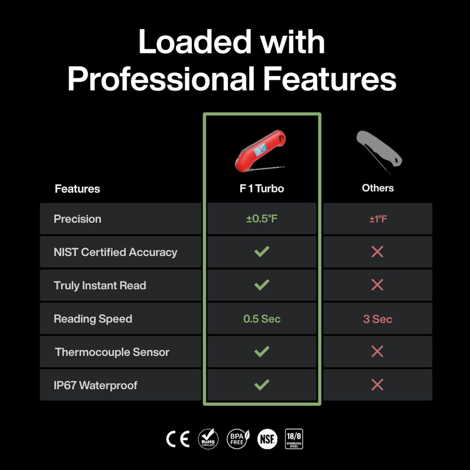 - Special Feature : 0.5 seconds Fast Reading System, Auto Off, Brighter Backlit, High Accuracy Up to ±0.5℉/±0.3℃, IP67 Waterproof 0.5 seconds Fast Reading System, Auto Off, Brighter Backlit, High Accuracy Up to ±0.5℉/±0.3℃, IP67 Waterproof