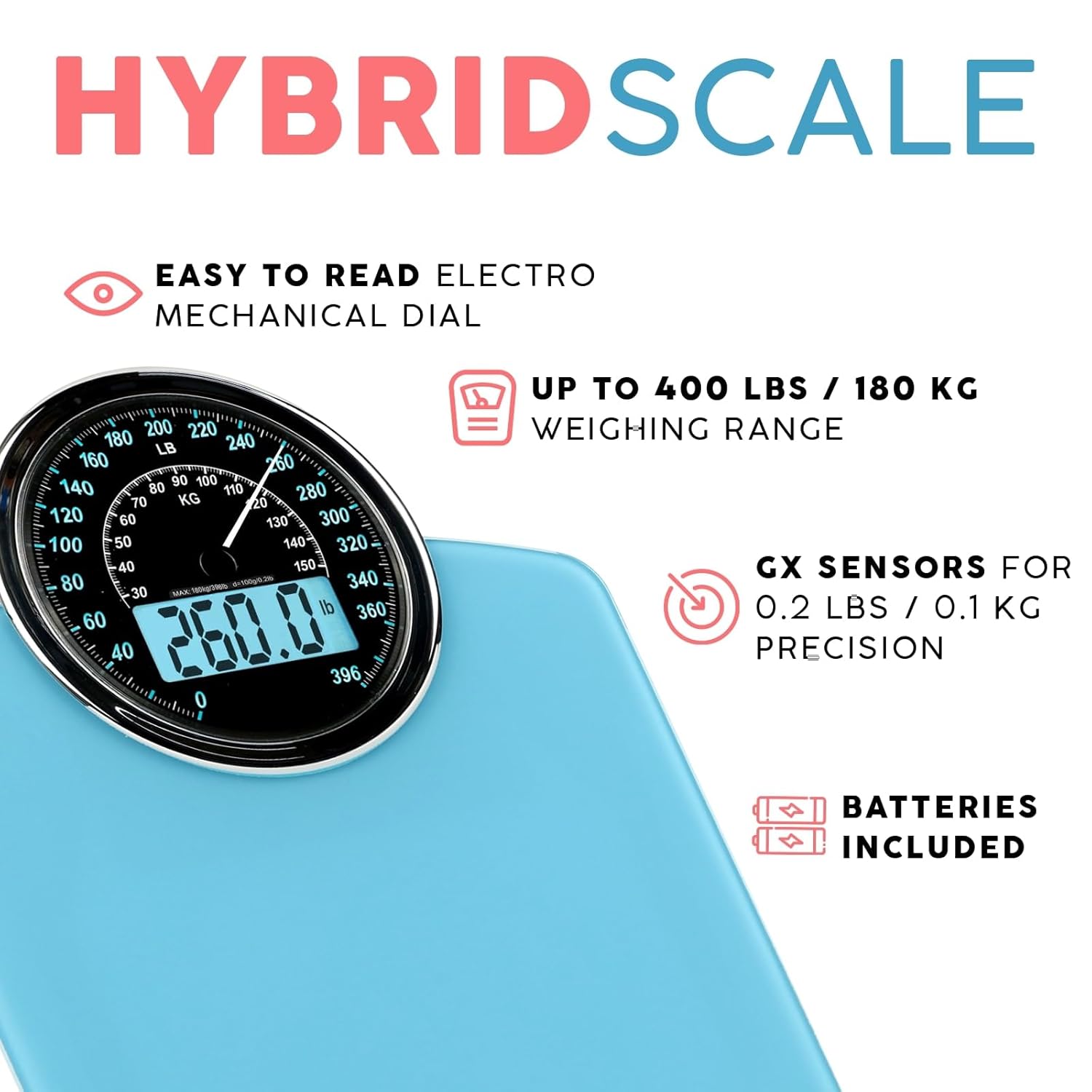 Adamson Hybrid 2-in-1 Analog & Digital Weighing Scale for Body Weight up to 400lbs - Thick Tempered Glass - Extra Large Display - Easy to Read Digital Bathroom Scale - New - Light Blue