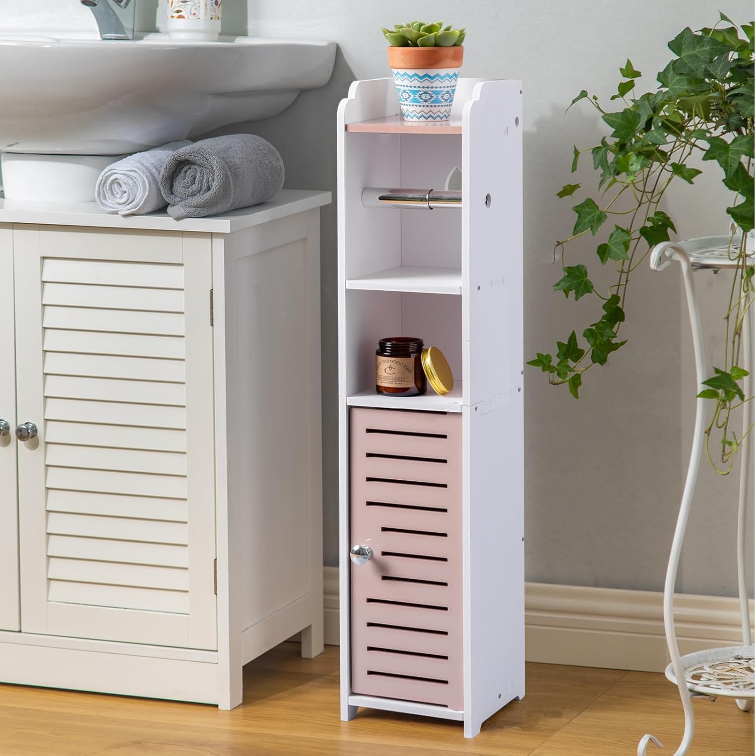 AOJEZOR Toilet Paper Holder Stand: Small Bathroom Storage Cabinet - Pinkish Rose - White