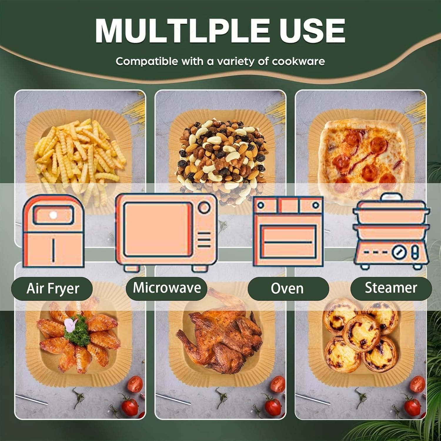 - 【Simple and Easy to Use】These non-stick disposable air fryer paper liners are designed in a square bowl shape, which can better accommodate food. There's no need to tear, fold, cut, or bend the parchment paper, simply take one out when preparing to cook, place it in the frying pan or microwave, and cook as you like. The 1.78-inch raised edge can protect the side of the fryer, prevent food from sticking and make it easy to remove the food. Simply throw it in the trash after use.