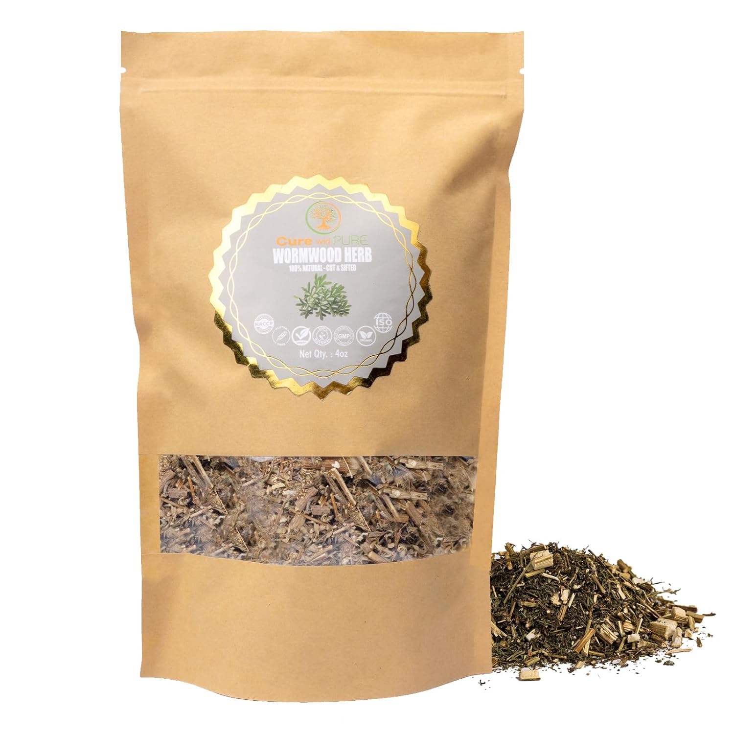 Cure wid Pure Organic Wormwood Herb Dried Cut & Sifted 4oz/114g - Artemisia Absinthium - Non-GMO,Preservative & Additives Free Wormwood Tea In Eco Friendly Resealable Pouch Traditional Herbal Remedy