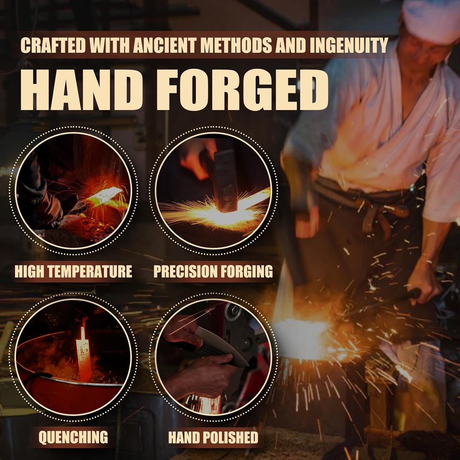 • OUTSTANDING QUALITY: The last kitchen knife set you will ever need. Our premium knives are made of the ultra-tough carbon steel ATS-34, and precision forged by experienced masters, the steel is repeatedly heated, folded and hammered, quenched and finely polished in multiple processes to make its internal structure uniform, ensuring the sharpness and stability of the blade. Nitrogen cooled for enhanced hardness and flexibility.