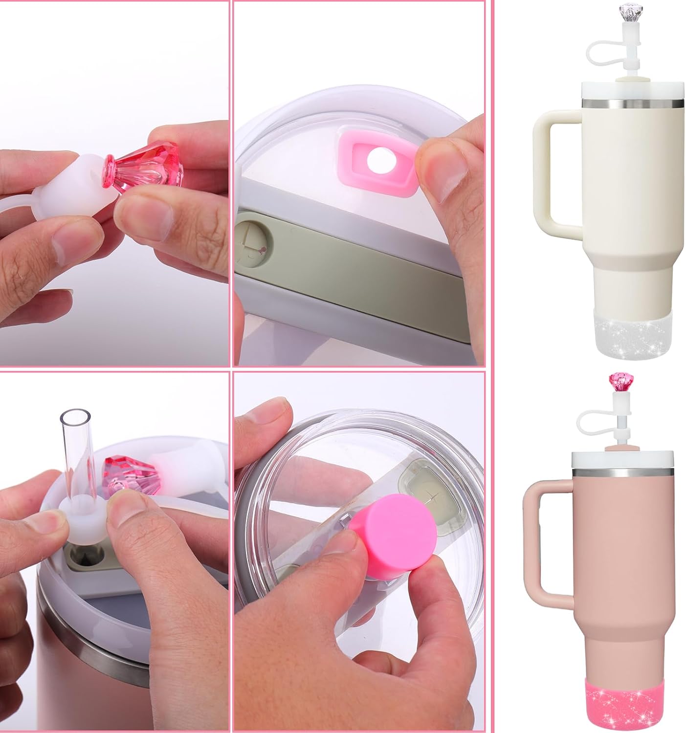 - [COMPLETE MUG SET]:The accessory set is very well matched for stanley mugs. The silicone leak-proof stopper features a 360° leak-proof design, the diamond straw lid is compatible with 9-11mm diameter straws, and the bottom protector protects the cup from impacts, scratches, slips, and prolongs the life of the cup. This set can meet your needs of protecting and dressing up your cups