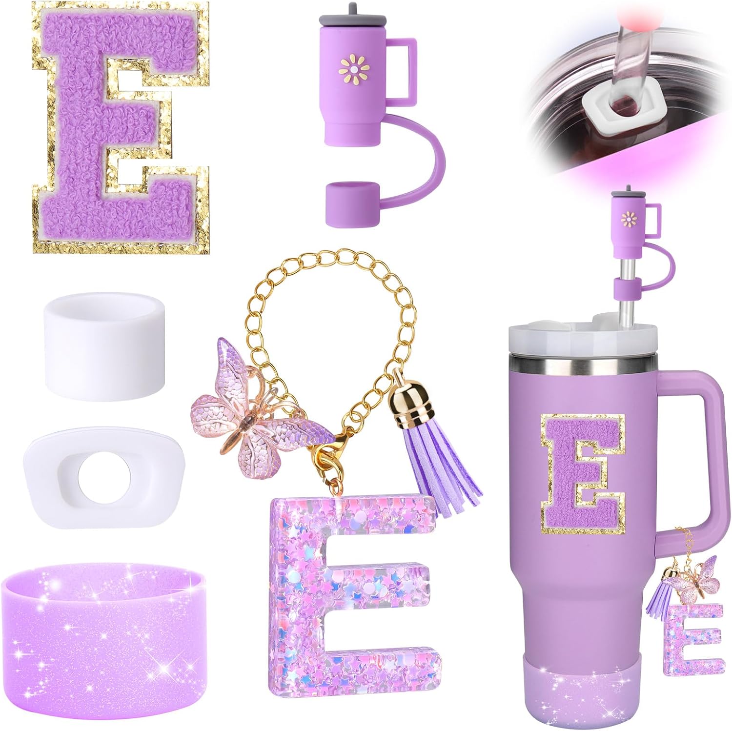 Mity rain 6PCS Cup Accessories Set for Stanley Cup 30oz 40oz tumbler with handle, Including Silicone Straw Topper Cover Cap and Boot, Spill Proof Stopper, Handle Charm, Initials Sticker (Letter E)