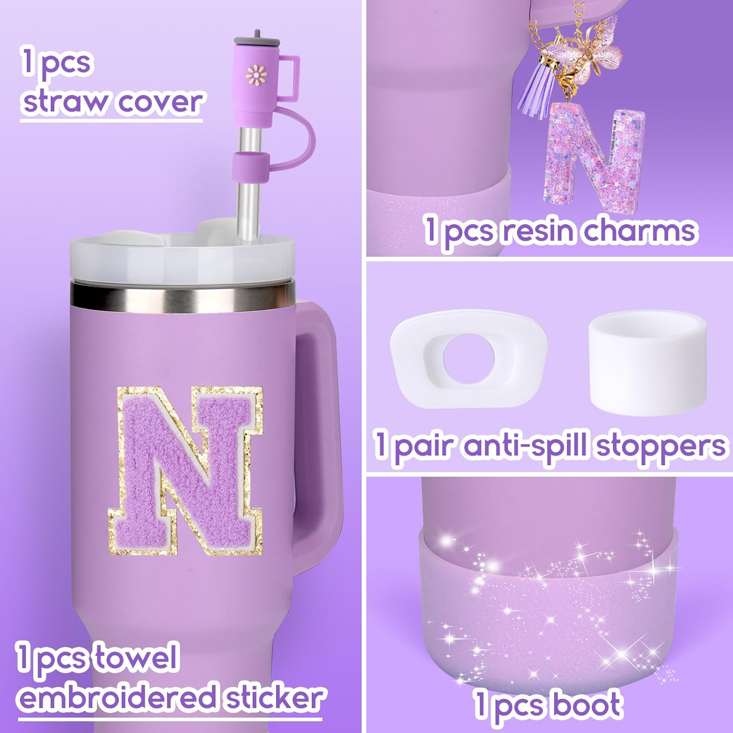 - You will get: 1pcs cup-shaped straw cover and 1pcs letter charm chain accessory specially customized for Stanley Tumber 30/40 oz handle, 1pcs round anti-spill stopper, 1pcs square anti-spill stopper, 1pcs cup cover, 1pcs letter sticker. These are great cup accessories(Note the packaging does not contain cup)