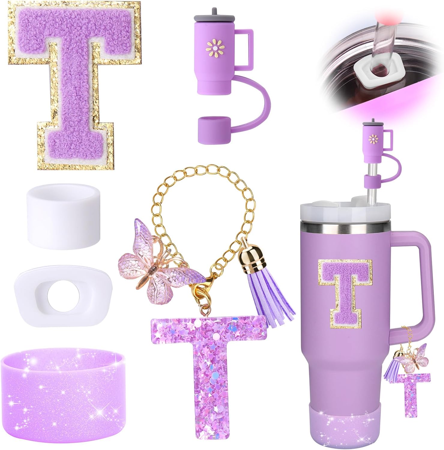 Mity rain 6PCS Cup Accessories Set for Stanley Cup 30oz 40oz tumbler with handle, Including Silicone Straw Topper Cover Cap and Boot, Spill Proof Stopper, Handle Charm, Initials Sticker (Letter T)
