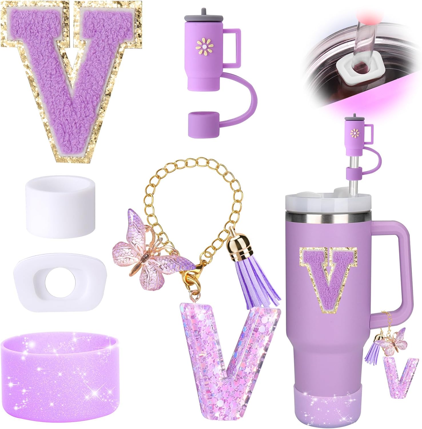 Mity rain 6PCS Cup Accessories Set for Stanley Cup 30oz 40oz tumbler with handle, Including Silicone Straw Topper Cover Cap and Boot, Spill Proof Stopper, Handle Charm, Initials Sticker (Letter V)