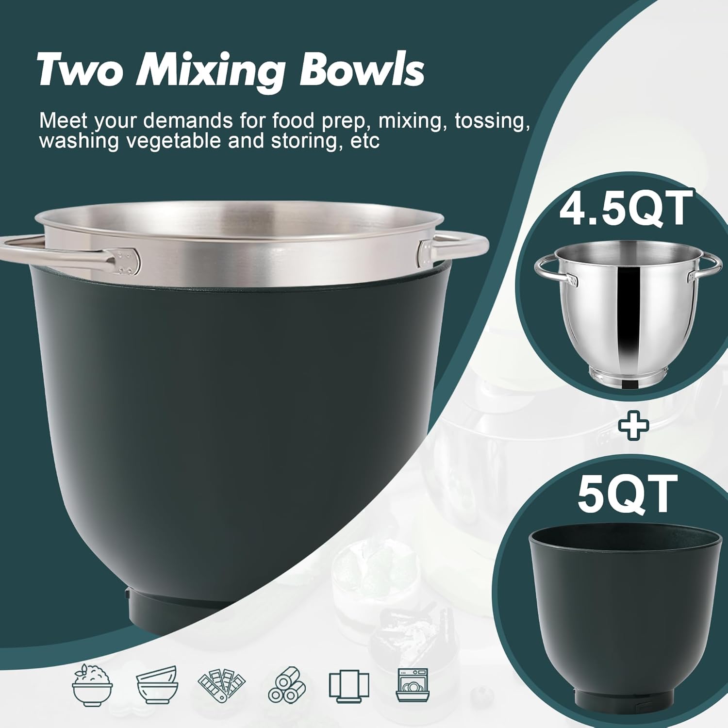 - Two Mixing Bowls- Our Stand mixer equipped with 4.5QT stainless steel bowl and 5QT extra food safe plastic mixing bowls, perfect for a variety of mixing and baking needs. Special Nesting design for nest two bowls together and offer space-efficient storage.
