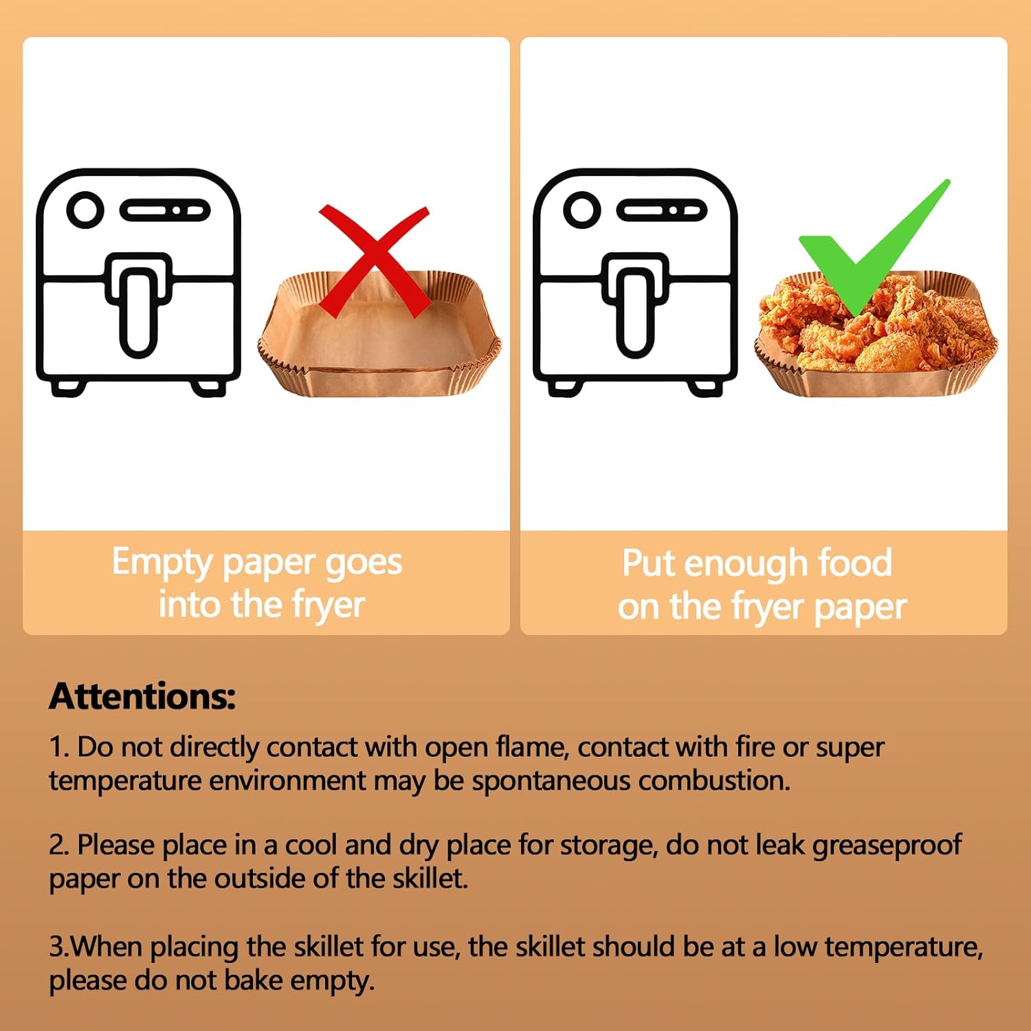 - [HIGH TEMPERATURE RESISTANCE]: The air fryer paper liners material is specially treated to withstand extremely high temperatures up to 428°F, ensuring that the food will not be damaged or deformed when frying.Meanwhile please make sure you put enough food in or the fryer sheet may catch fire!