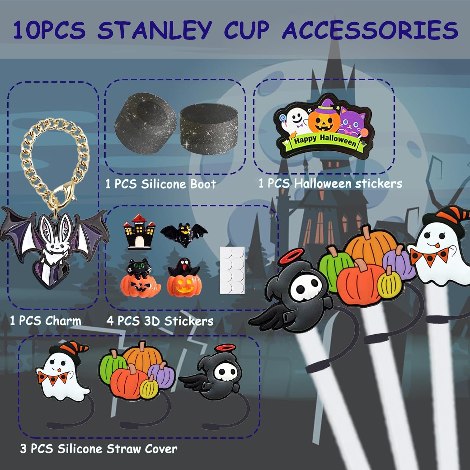 - Complete Package: 3pcs Straw Cover, 4pcs Halloween 3D Stickers & 1pcs Flat Stickers, and 1pcs Halloween bat Handle Charm, 1pcs Silicone Boot for Stanley Cup. Suitable for Stanley Quencher 30/40 oz and Stanley IceFlow 20/30 oz tumblers water bottles & others cup bottom diameter 2.75-2.95 inch