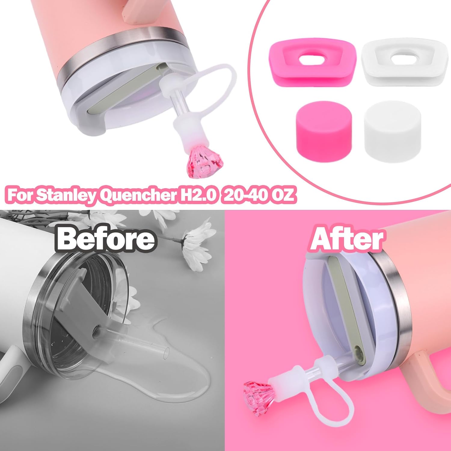 - [WIDE COMPATIBILITY]: Our Spill Stopper Set accessories fit Stanley Quencher 1.0/ H2.0, 40 oz/ 30 oz, Straw Lid fits 9-11 mm diameter straws perfectly, Silicone Sleeve is compatible with cup base diameter 2.75-2.95", which can meet and match with many brands of non-slip straw cups on the market. For example for stanley cup, for Yeti/Owala/Meoky/Hydroflask cup straws