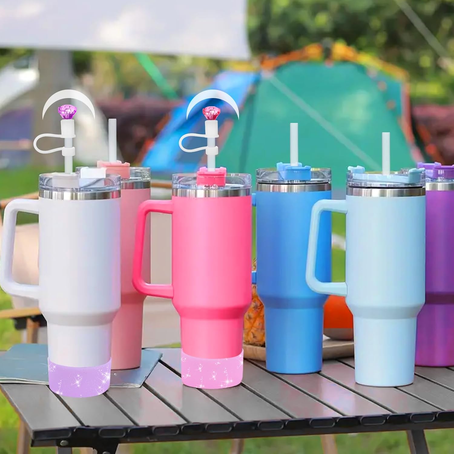 - [COMPLETE MUG SET]:The accessory set is very well matched for stanley mugs. The silicone leak-proof stopper features a 360° leak-proof design, the diamond straw lid is compatible with 9-11mm diameter straws, and the bottom protector protects the cup from impacts, scratches, slips, and prolongs the life of the cup. This set can meet your needs of protecting and dressing up your cups