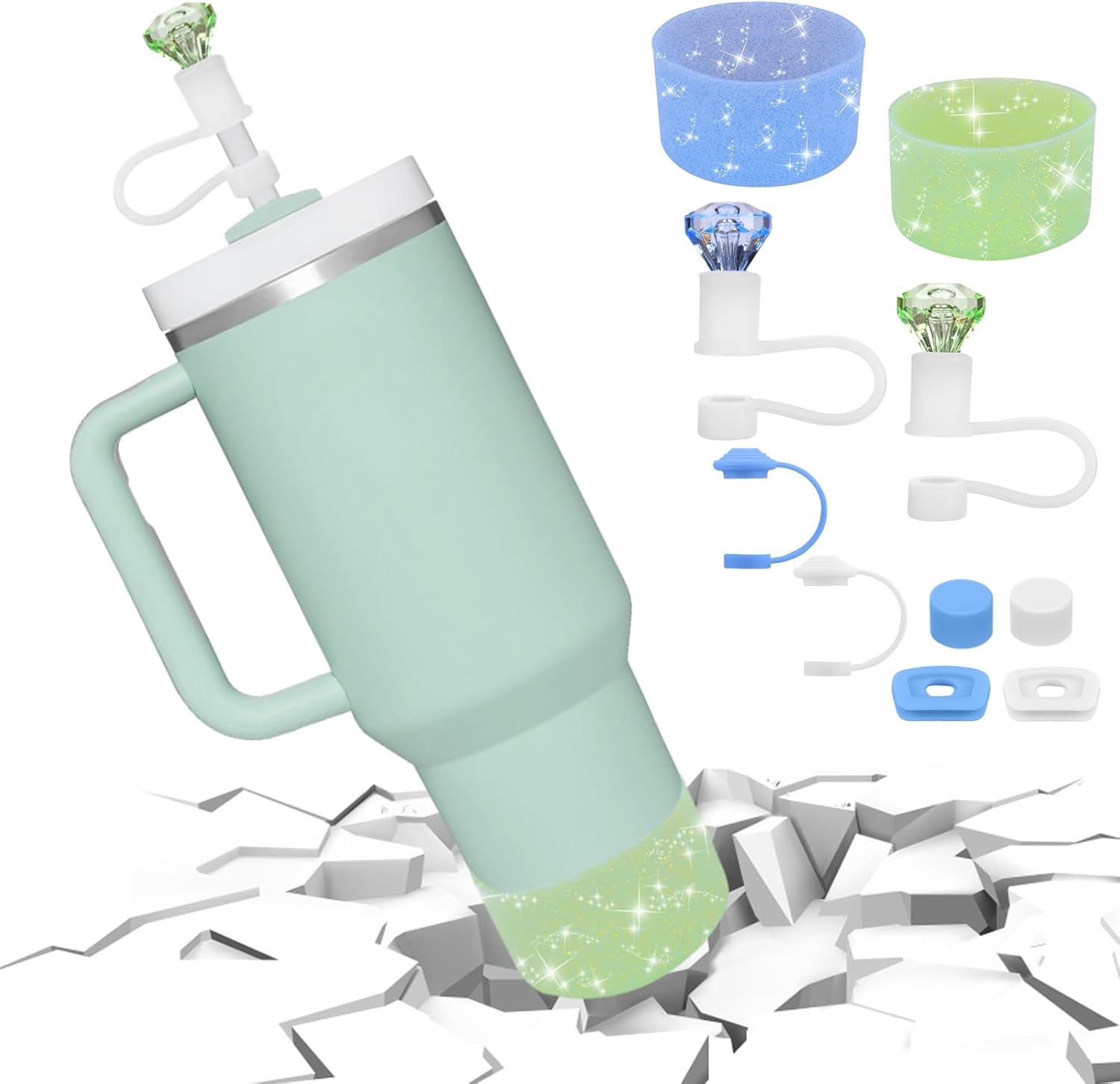 Mity rain Set for Stanley Cup Accessories, Including 2Pcs Straw Topper, 4Pcs Silicone Spill Proof Stopper, 2Pcs Protective Glitter Silicone Boot, Set for Stanley Cup 40/30 OZ (Blue+green)