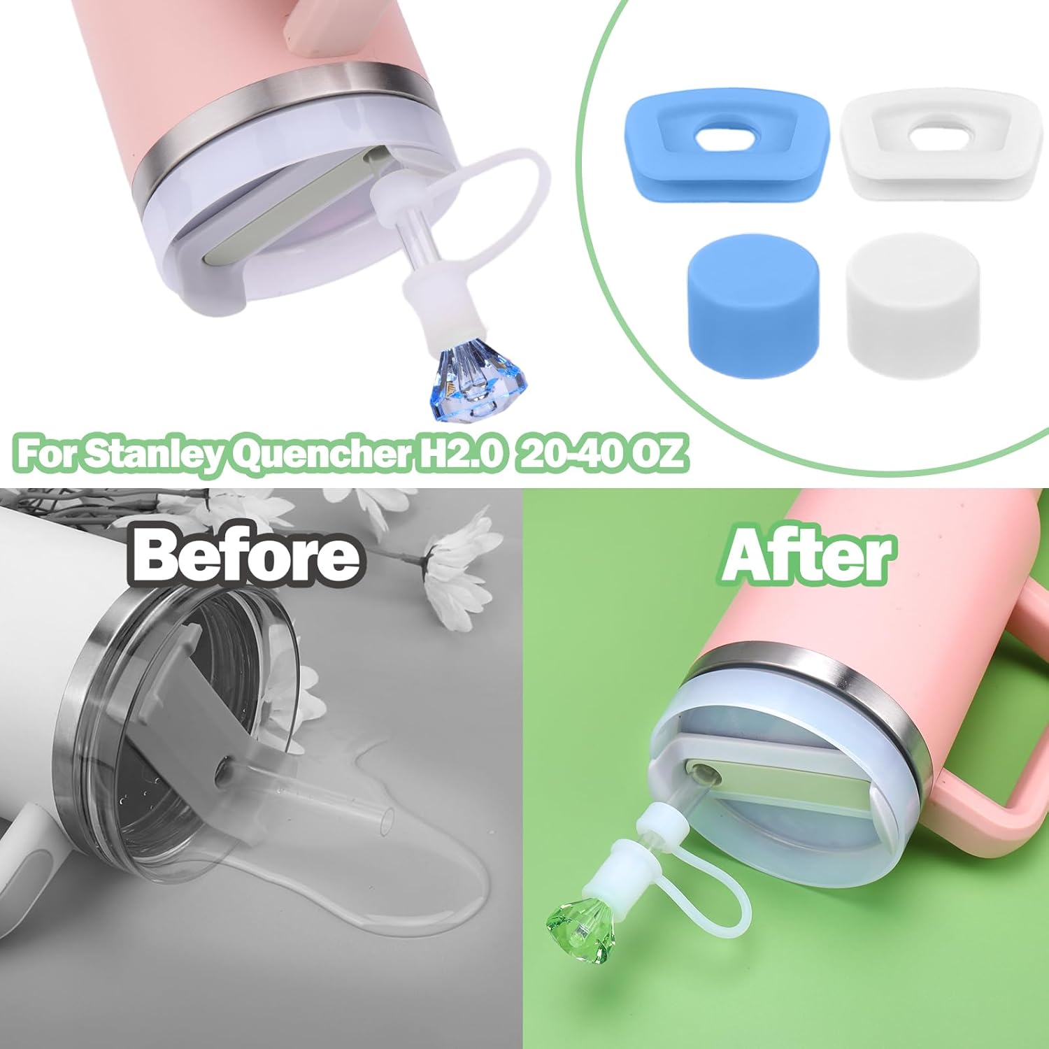 - [WIDE COMPATIBILITY]: Our Spill Stopper Set accessories fit Stanley Quencher 1.0/ H2.0, 40 oz/ 30 oz, Straw Lid fits 9-11 mm diameter straws perfectly, Silicone Sleeve is compatible with cup base diameter 2.75-2.95", which can meet and match with many brands of non-slip straw cups on the market. For example for stanley cup, for Yeti/Owala/Meoky/Hydroflask cup straws