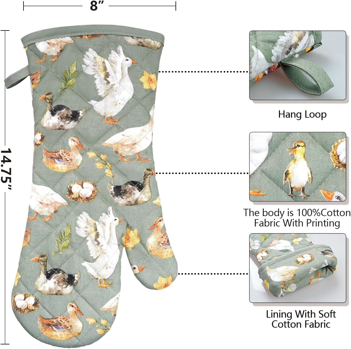 - 1.EXTRA-LONG SIZE, ECO-FRIENDlY ADN HEATRESISTANT: Our Home kitchen oven mitt with a longer length 8’’X14.75’’, are widely used for cooking, barbecue, microwave oven, soup cooking and so on. It brings you and your family a better protection. Waterproof, cold proof and keep you away from steam scald.