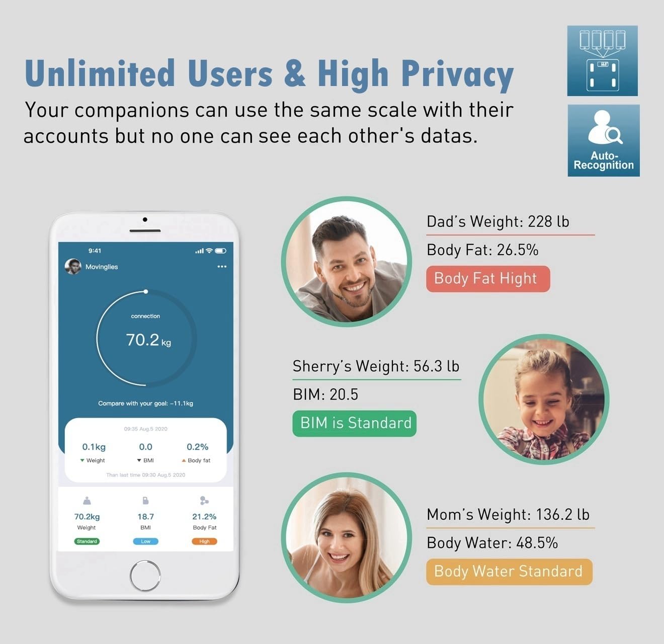 - 【User-friendly App with Baby Mode】MovingLife APP allows you to set a goal, monitor your fitness trends with an automatic chart, track your historical data for comparison. Easily deduct yout weight from you while you hold your baby on hand for getting the baby's weight.