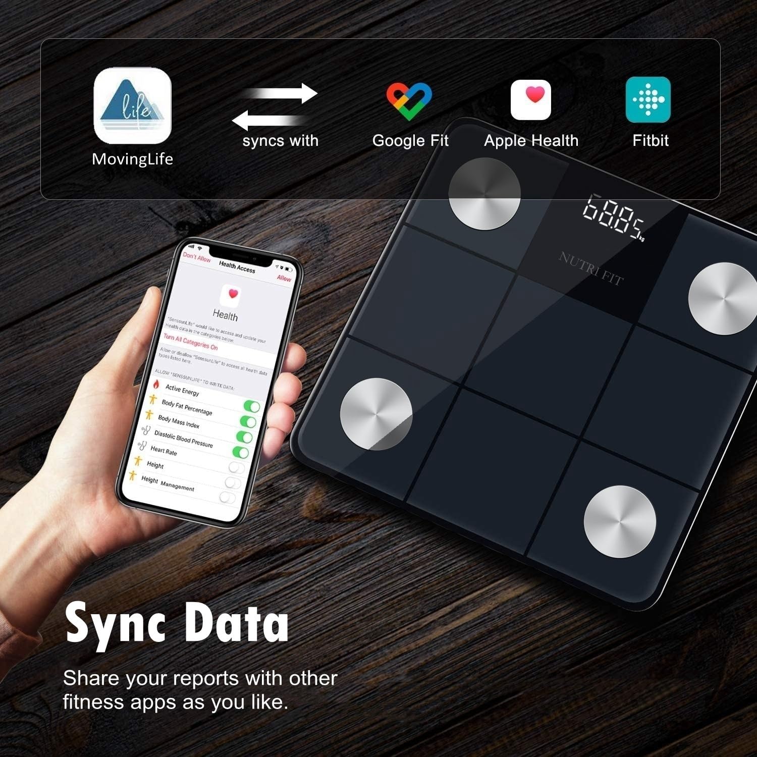 - 【Sync Weight Data to Other APP】Use the MovingLife APP to sync your data with Apple Health, Google Fit or other fitness apps to view trends and track progress in one central location. Support the system for Bluetooth 4.0, android 4.3 & IOS 8.0 or above.