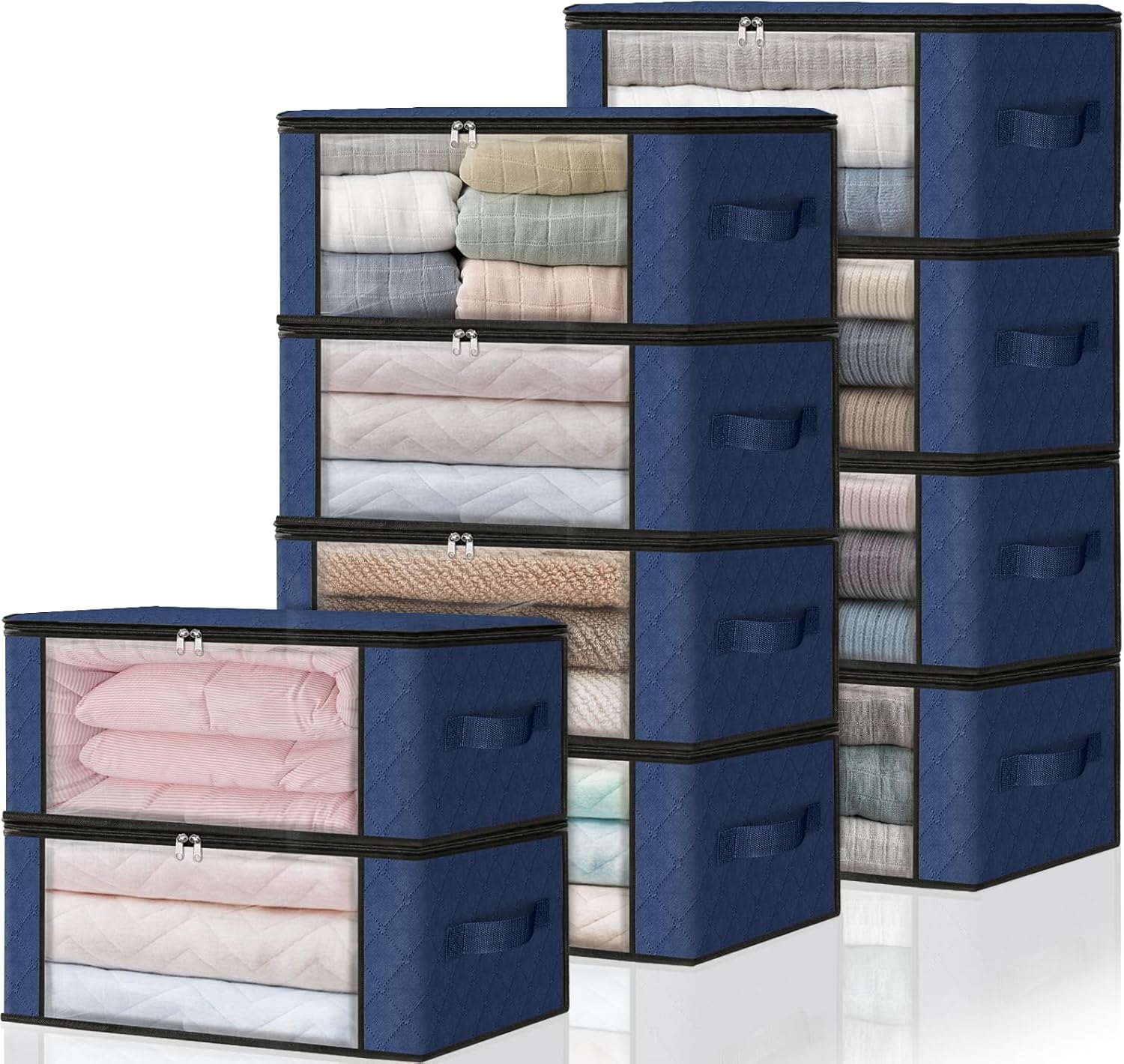 HomeHacks Storage 10-Pack Clothes Organizer Storage Bags Foldable Storage Box with Large Clear Window Sturdy Handles for Closet, Dorm, Pillows, Bedding, Clothes, Blankets, 35L, Blue