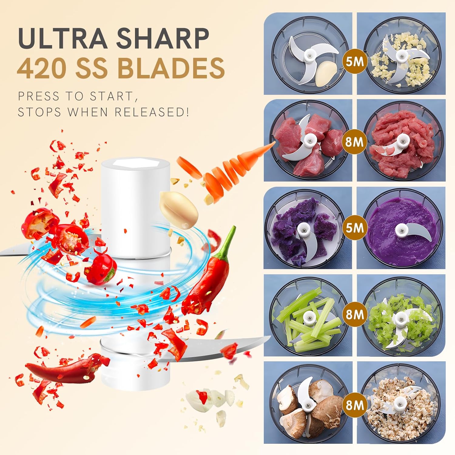- Easy and Convenient: This food chopper electric is very simple and easy to use. Press and hold the top button to start the motor, and release to stop it, making you control the degree of food chopping, very easy to use. Ingredients such as garlic and onion can be chopped in a few seconds.