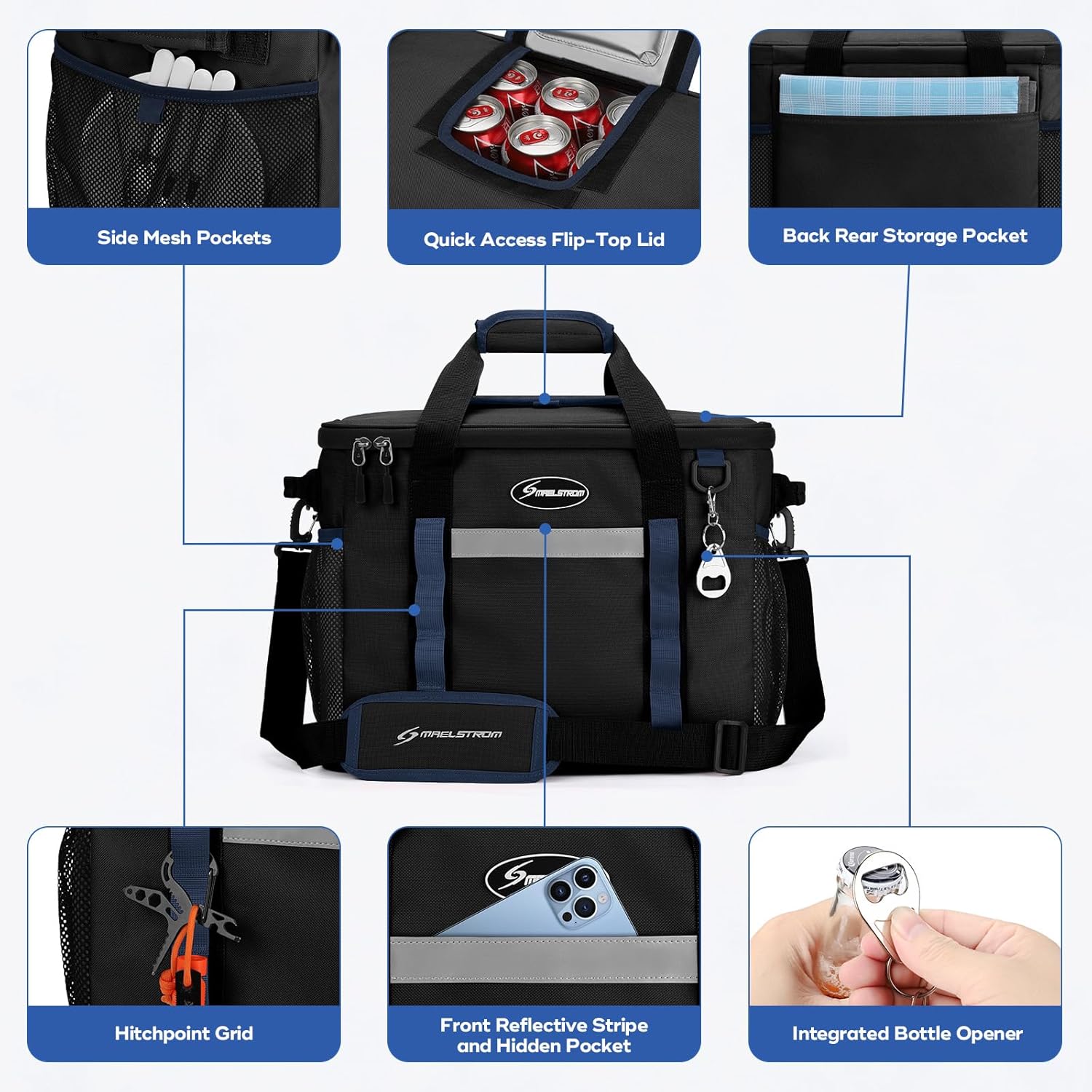 - EXTRA LARGE CAPACITY - The Maelstrom Icy Hollow Soft sided cooler will hold up to 55 cans of your favorite drinks plus 2-4 ice-packs.Whether it's camping, hiking, picnicking, or a BBQ party, this cooler bag easily packs a lot of food, fruits, beer, meat, or even seafood together.It’s large enough to carry all.
