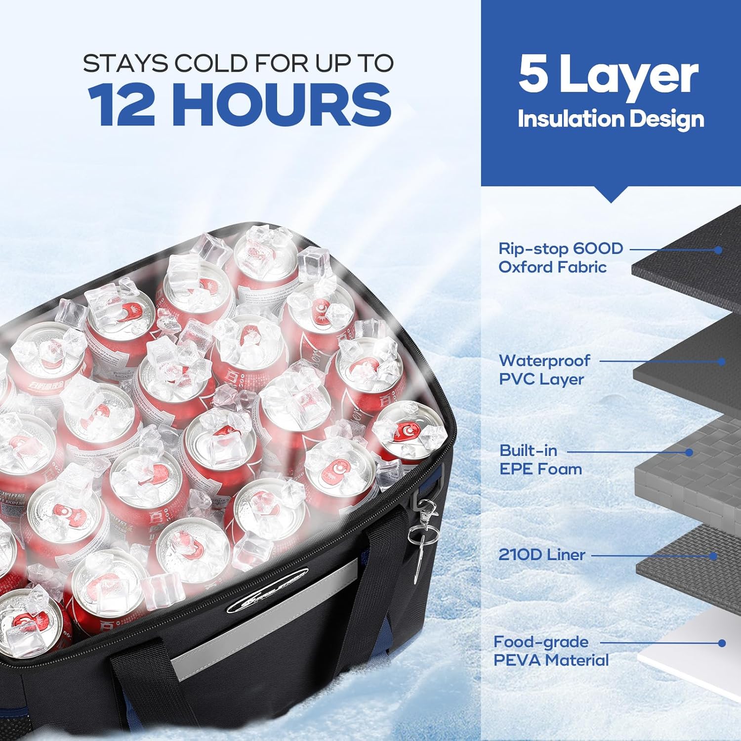 - STAYS COLD LONGER - Thoughtful 5 layer insulation design.Exterior surfaces are made of rip-stop 600D Oxford materials plus one layer of waterproof PVC.Interior layers are thicker, reinforced food-grade PEVA materials with seamless ultrasonic welding for 100% leakproof and tear-resistance.A built-in EPE foam middle layer and 210D liner add additional insulation, allowing the Maelstrom Icy Hollow Soft Sided Cooler Bag to keep food or drinks cold for up to 12 hours.