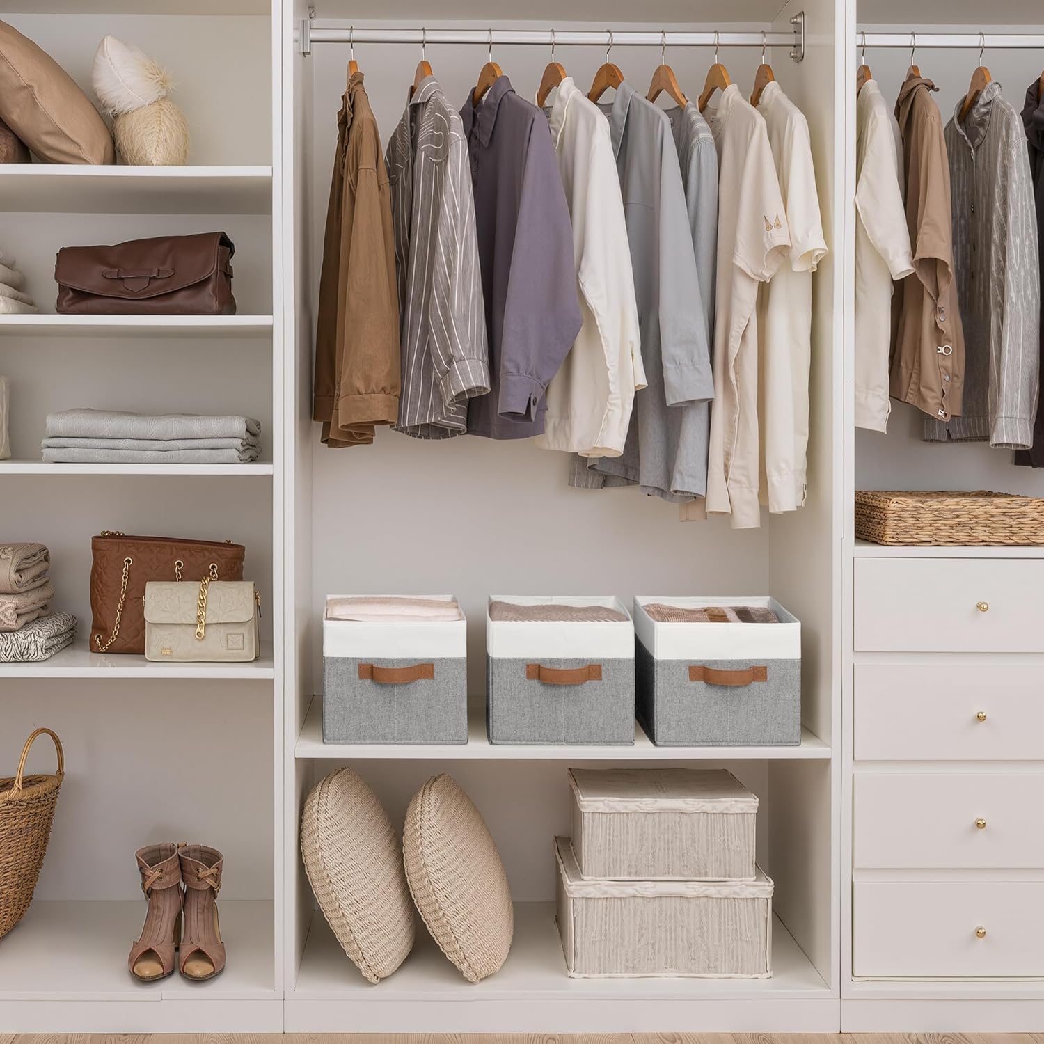 StorageWorks Storage Baskets for Shelves, Foldable Fabric Closet Storage Bins with Handles, Fabric Storage Bins Clothes Organizer, Gray and White, 3-Pack, Large