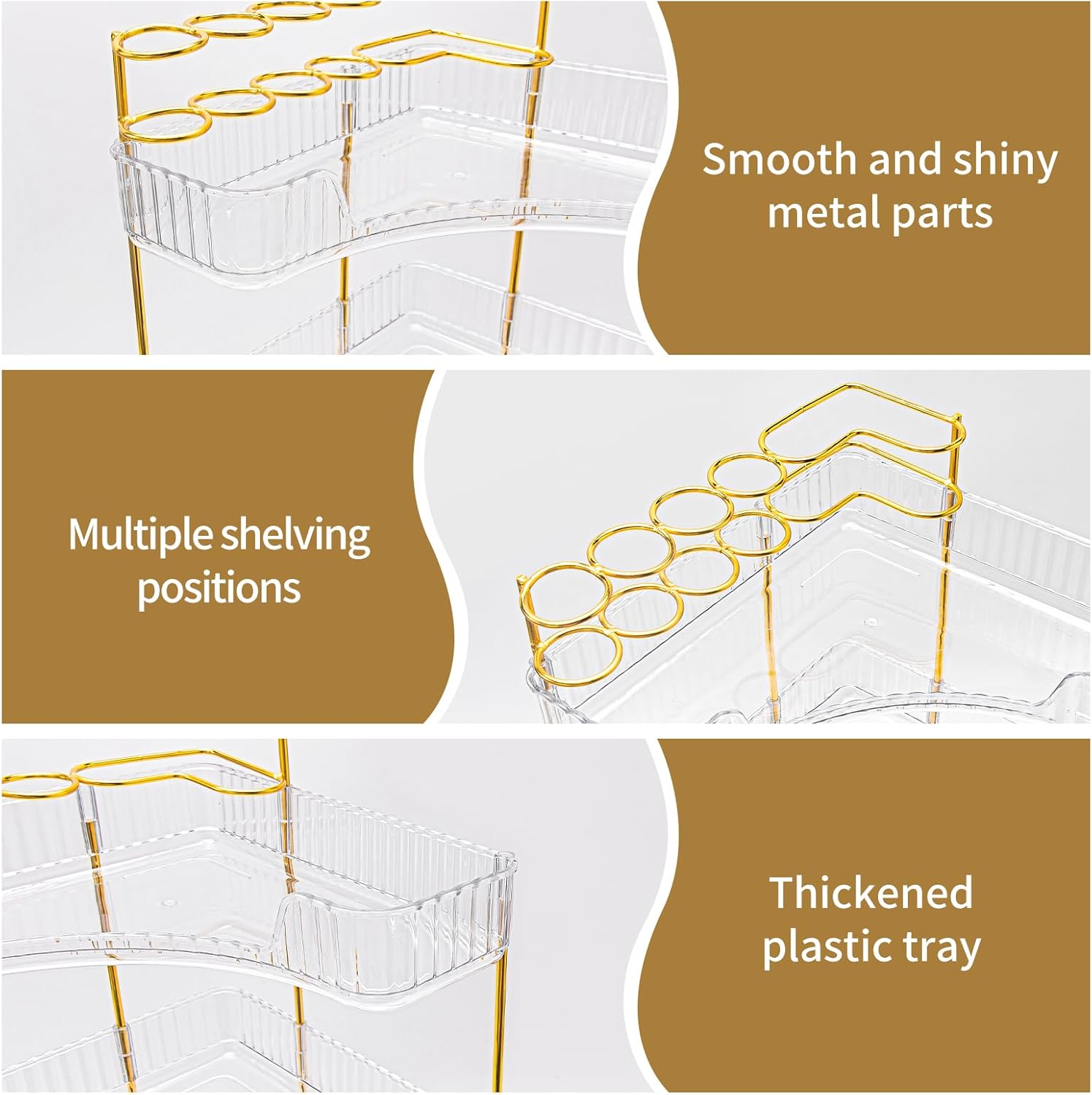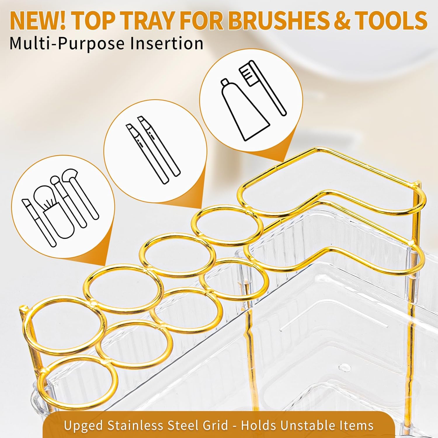 - Upgraded Design with Brush Holder: New 90° corner shelf organizer a stainless steel grid top layer to store beauty sponges, makeup brushes & toothbrushes securely. Say goodbye to cluttered counters – now every item has its place