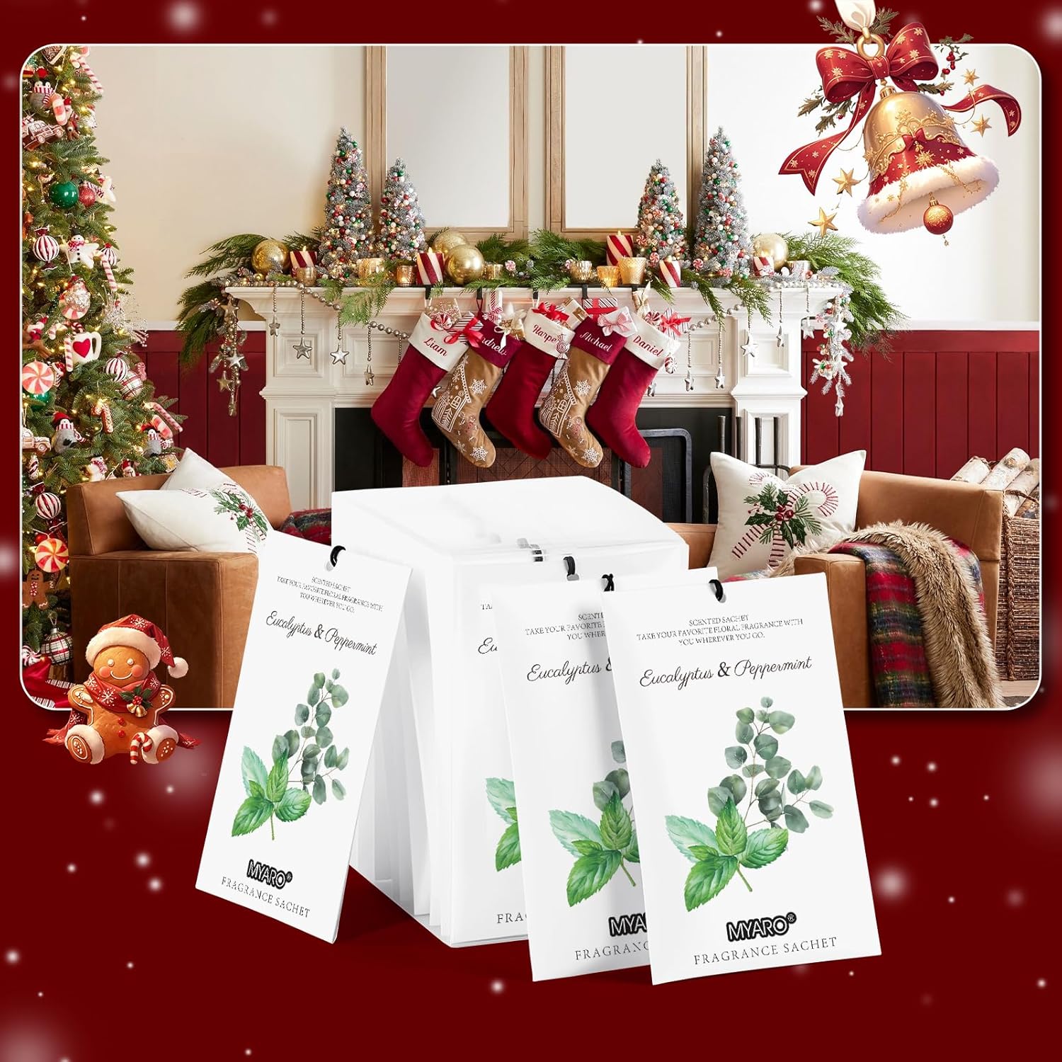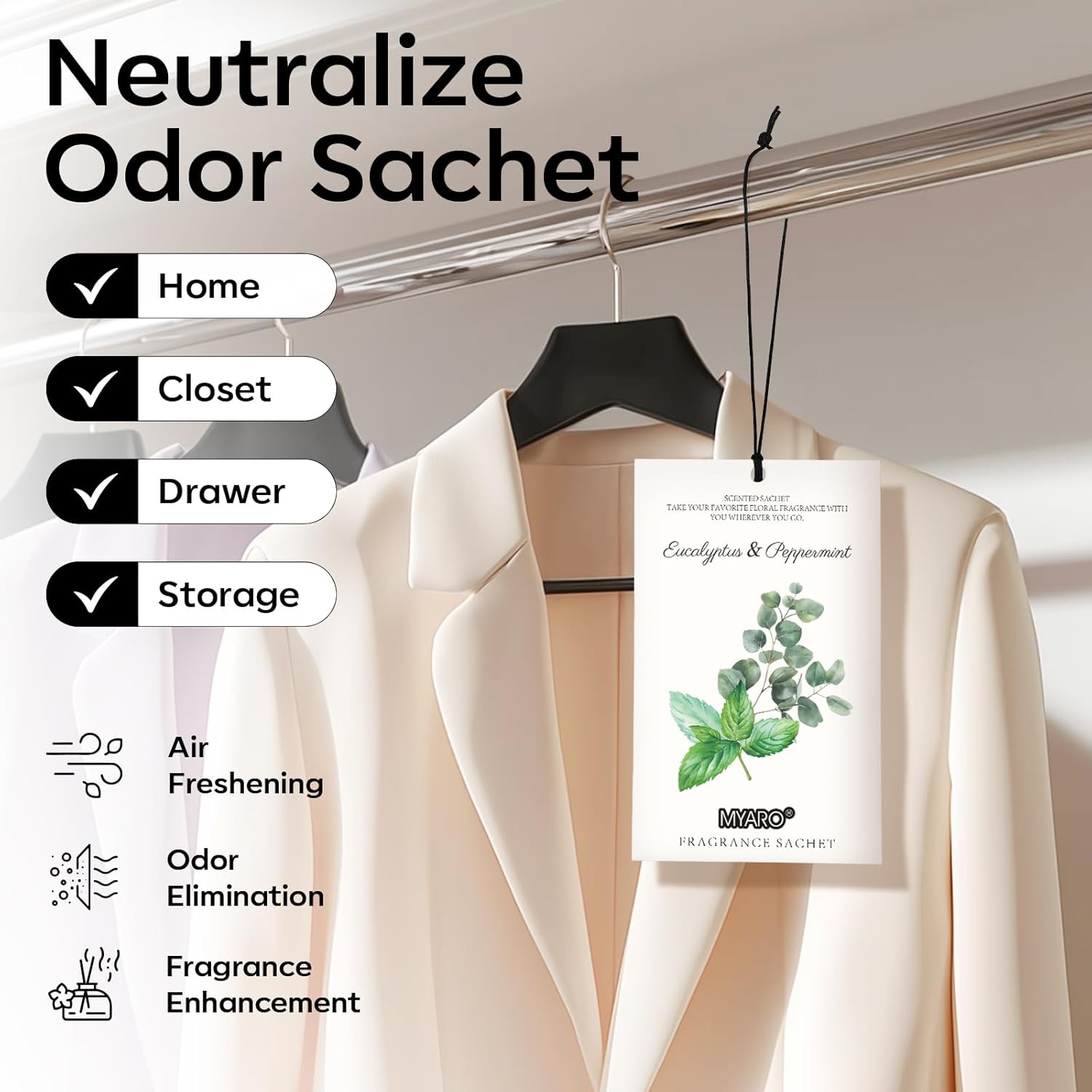 - MYARO Eucalyptus Mint Sachet Bags: Includes 12 scented sachets (each bag size: 4.13 inch x 2.76 inch). Our natural fragrance will take you on a journey with the fresh scents sachet packets