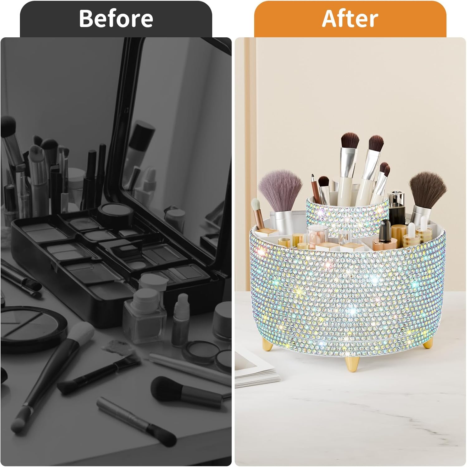 Bling 360° Rotate Makeup Brush Holder Organizer, Makeup Organizers Countertop, Makeup organization and Skincare Storage for Vanity, Gift for Women Girls (Bling dz-White AB)