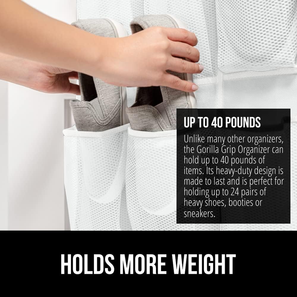 GORILLA GRIP Over the Door Shoe Organizer, 24 Extra Large Breathable Mesh Pockets, Space Saving Hanging Storage Holder, 4 Hook Closet Rack Hanger, Hangs on Closets for Shoes and Accessories, White
