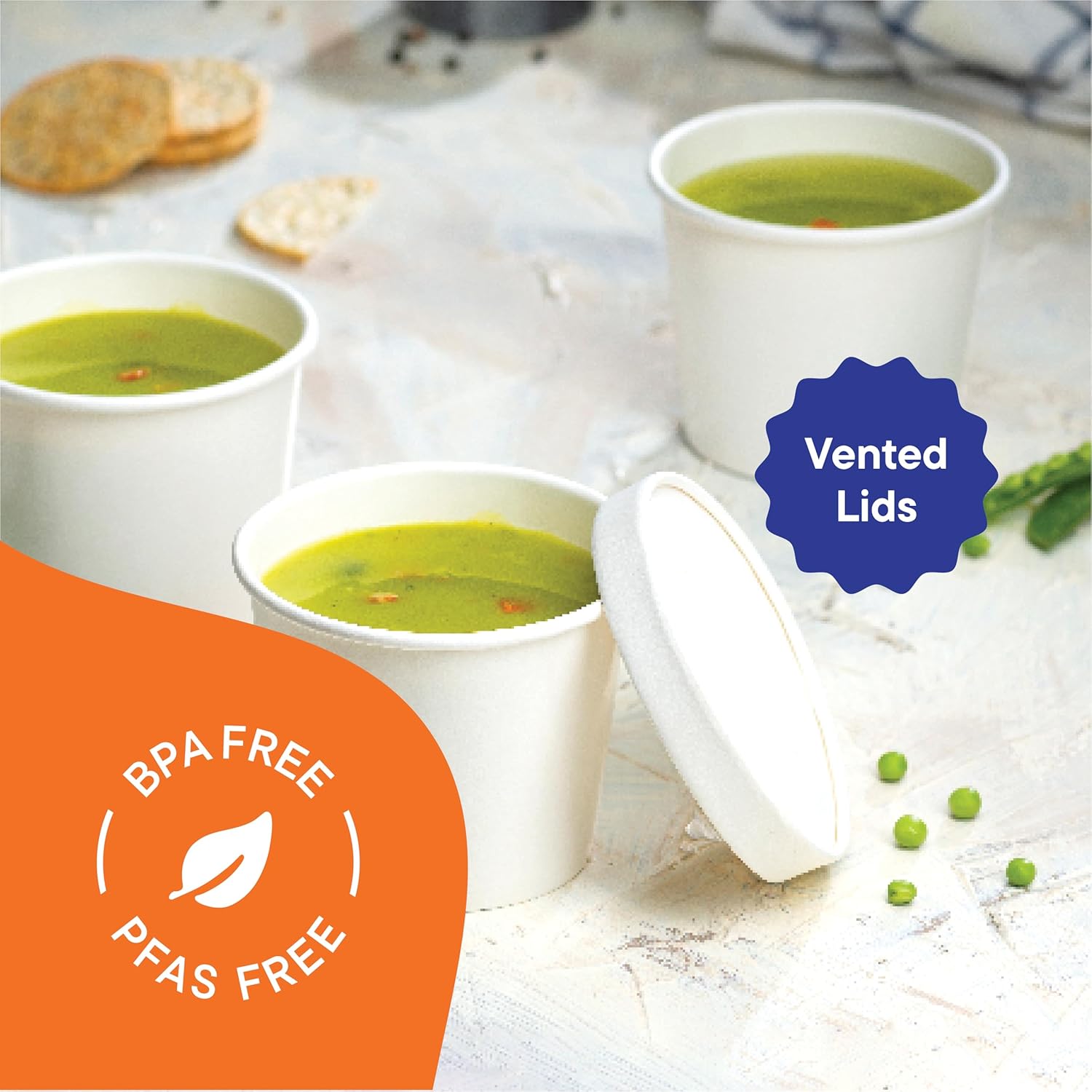 - Vented Lid: The container and lid combo include a vented paper lid that lets hot, moist air out before it becomes stuck within the container. It is a crisp, white color for a clean presentation every time. It's made of the same double poly-coated paperboard as the container, so you know it's both durable and moisture resistant.