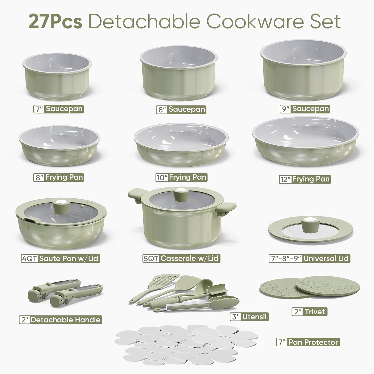 • Set Includes: 8'' fry pan, 10'' fry pan, 12'' fry pan, 1.5-qt saucepan, 3-qt saucepan, 4-qt saucepan, 4-qt sauté pan with lid, 4.5-qt stockpot with lid, 7''-8''-8.5'' universal lid, 2*trivets, 2*detachable handles, fish turner, solid turner, ladle, tongs, potato masher, 7*pan protectors.