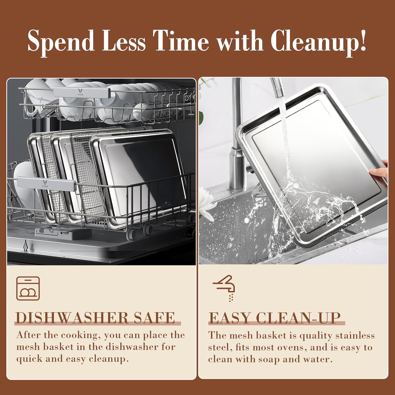 - 【Right-angle border design, zero dead corners of cleaning】 Our upgraded air fryer oven basket is made of two layers of steel wire with a diameter of 0.9mm, and its load-bearing capacity has been improved by 50%. Strengthened stainless steel frame + anti-slip right angle slot air fryer oven basket, stable and anti-turning; the smooth surface avoids any risk of scratches, It is easy to clean with soap and warm water after use, Also you can put it in the dishwasher.