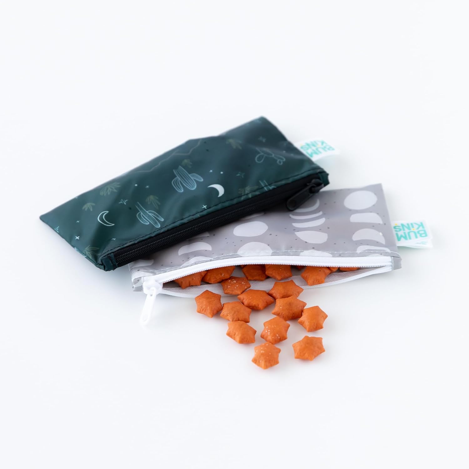 Bumkins Reusable Snack Bags, for Kids School Lunch and for Adults Portion, Washable Fabric, Waterproof Cloth Zip Bag, Supplies Travel Pouch, Food-Safe Storage, 2-pk Desert Night Dk. Green and Gray
