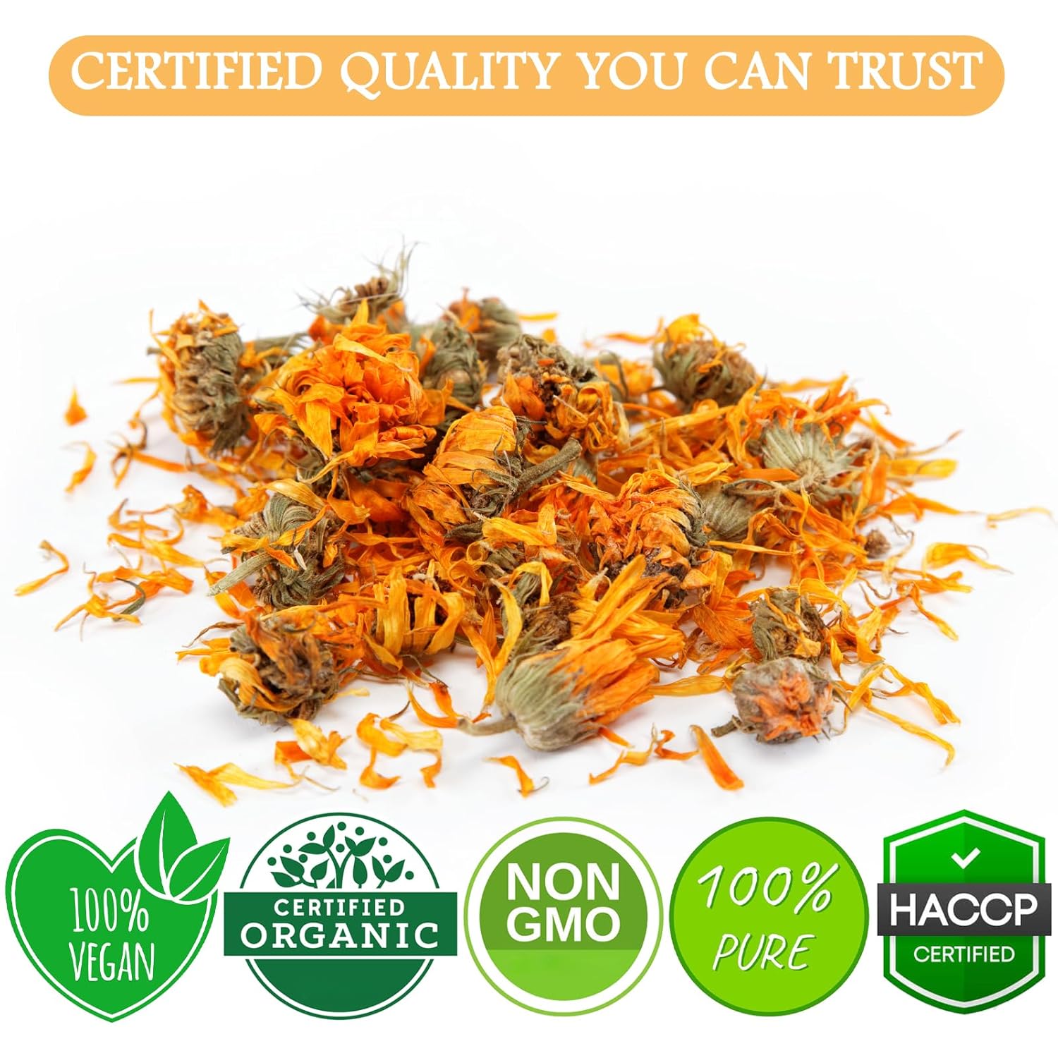 • ๐ŸŒฟ Certified Organic Calendula Flowers โ€“ Pure, Potent, Perfect Hand-picked at full bloom and gently dried to lock in their vibrant color, rich aroma, and nutrient power, these calendula flowers dried organic are your go-to for calming teas, soothing skincare, and holistic wellness remedies