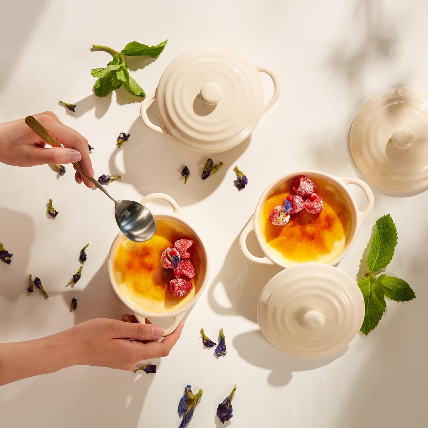 Kook Ceramic Mini Cocotte Set, Small Casserole Dishes with Lids and Handles, Individual Baking Ramekins, Oven, Microwave & Dishwasher Safe, Stoneware, 12 oz, Set of 4 (Ivory)