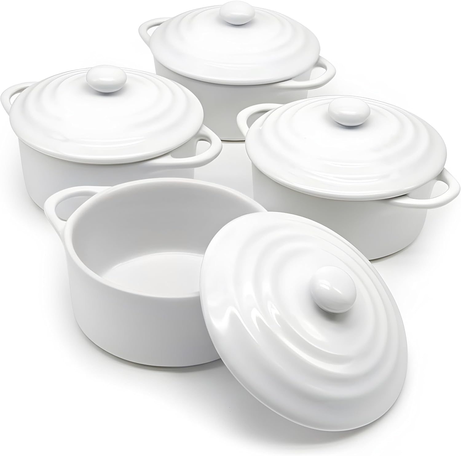 Kook Ceramic Mini Cocotte Set, Small Casserole Dishes with Lids and Handles, Individual Baking Ramekins, Oven, Microwave & Dishwasher Safe, Stoneware, 12 oz, Set of 4 (Swiss White)