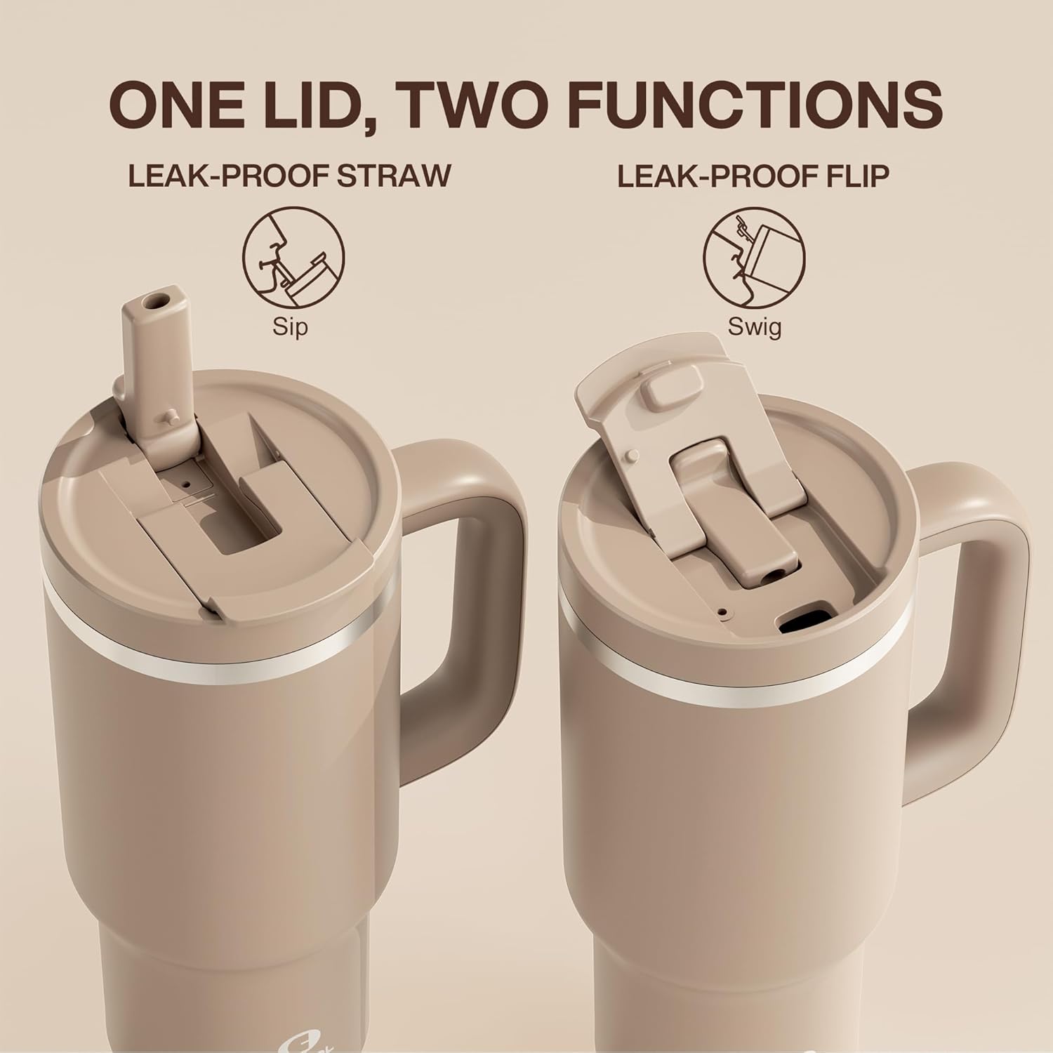 ENCOOL 32 oz Tumbler with Handle and Straw: Stainless Steel Insulated Tumbler Keeps Cold for 24 Hours, Leakproof Travel Cup Fits in Cup Holder and BPA-Free,Raw Umber