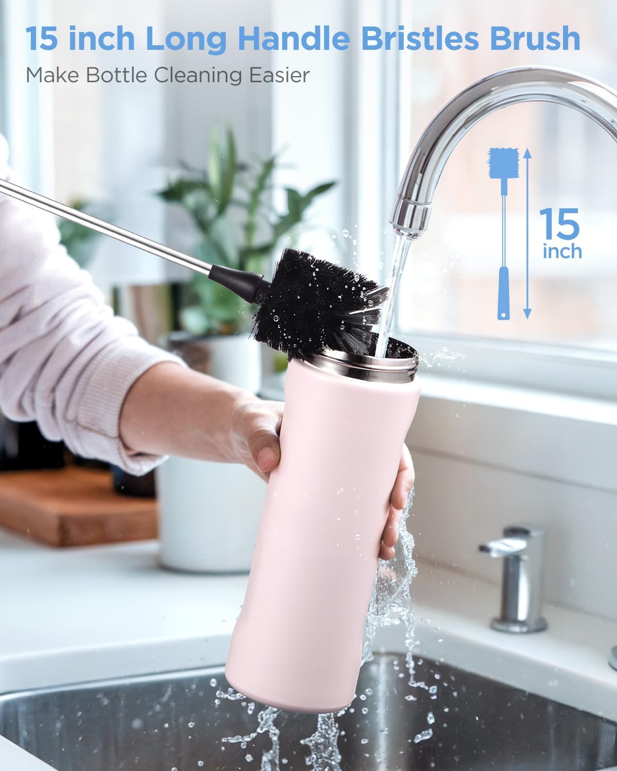 - 【15" Long Stainless Steel Scrubber】:This 15-inch long-handled bottle brush conquers tall water bottles [such us Stanley Cup/hydroflask/Owala Water Bottles], carafes, and deep Ice Tea jars. Featuring soft black bristles that safely clean delicate glassware without scratches, paired with sturdy grey tip bristles to powerfully scrub bottle bottoms and tight corners.