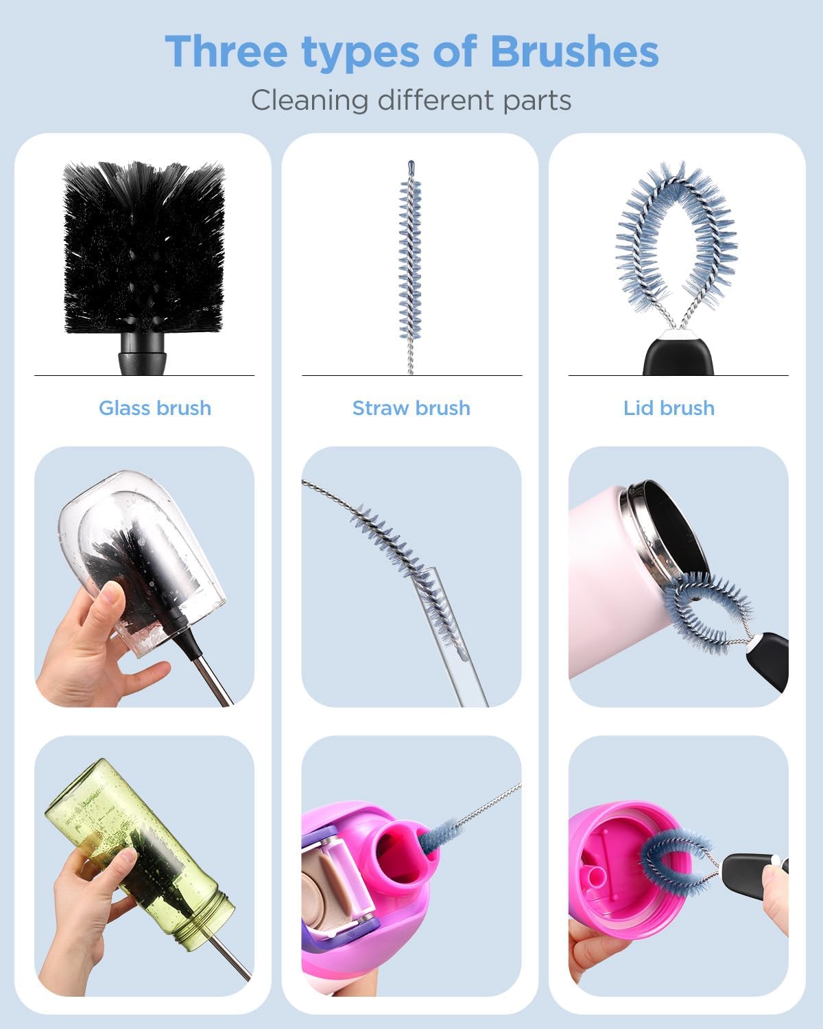 - 【With Extra 2 PCS Compact Straw Cleaner Brush & Nipple Brush 】:This bottle brush cleaner is not just for Owala Stanley Yeti Hydroflask Tumblers water bottles Cap, but also great for wine decanters/Baby Bottles/sink drains/Juicer blades. 3 pcs bottle brush to clean them all, ideal for homes, cafes, and restaurants.