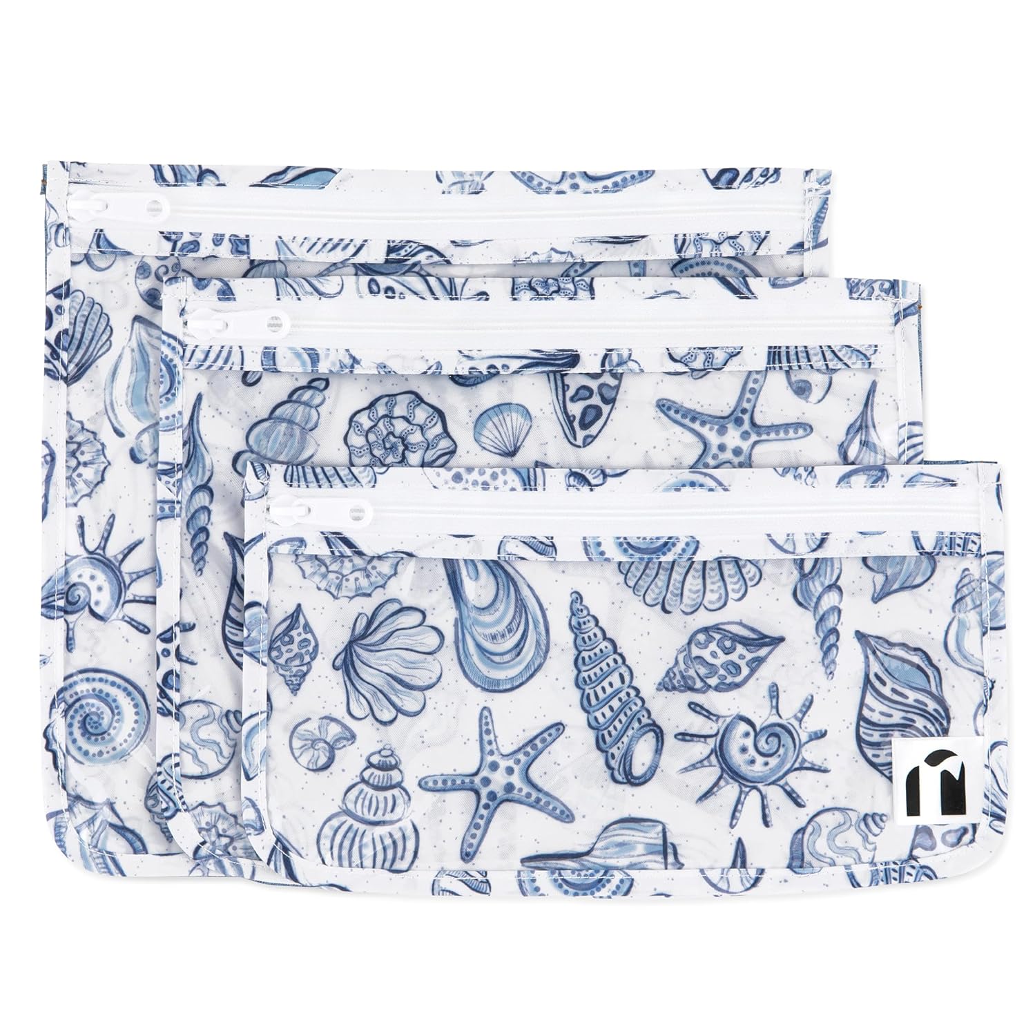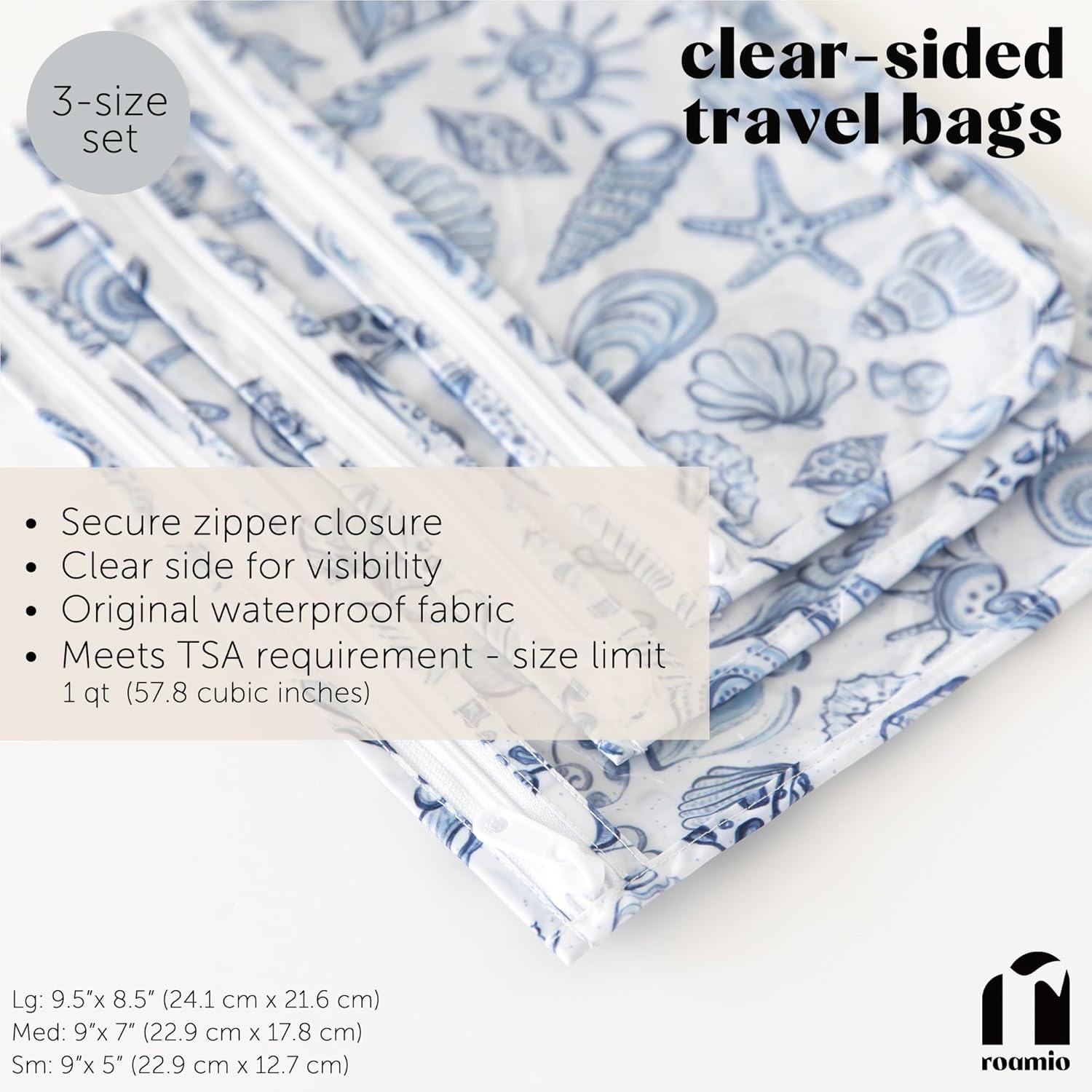 Roamio Travel Bag, Toiletry, TSA Approved Pouch, Zip Quart Size Airline Compliant, Clear-Sided, Baby, Diaper Bag Organization, Makeup, Accessories, Carry On Packing, Set of 3 Sizes, Blue Shells