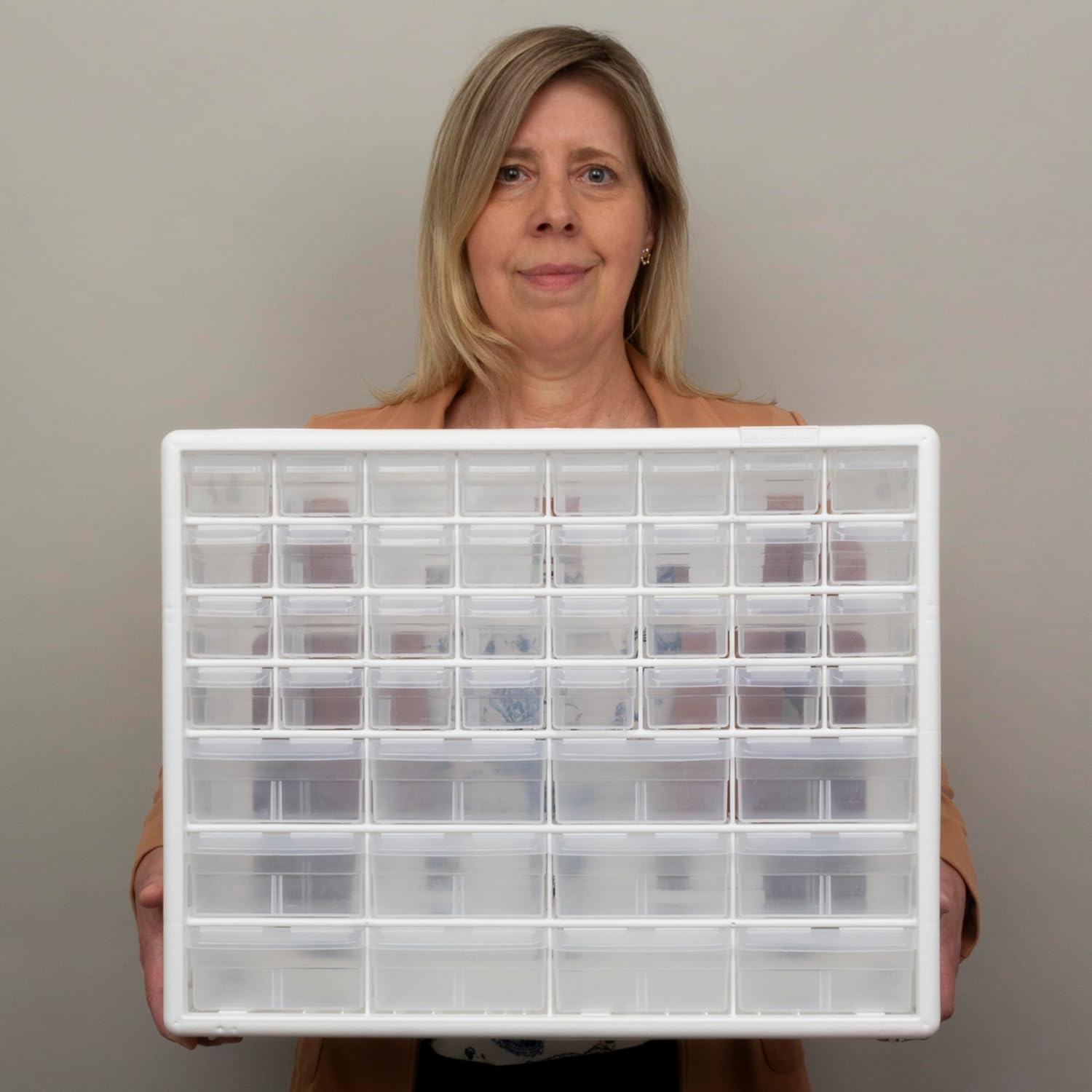 - HEAVY DUTY CABINET WITH 44 DRAWERS: The 44-drawer small storage cabinet is made in the U.S.A. from rugged, high-impact plastic and measures 20" W x 6" D x 16" H; Organizer drawers - 6" x 4-1/2" x 2-3/16" (large); 6" x 2-1/4" x 1-5/8" (small)