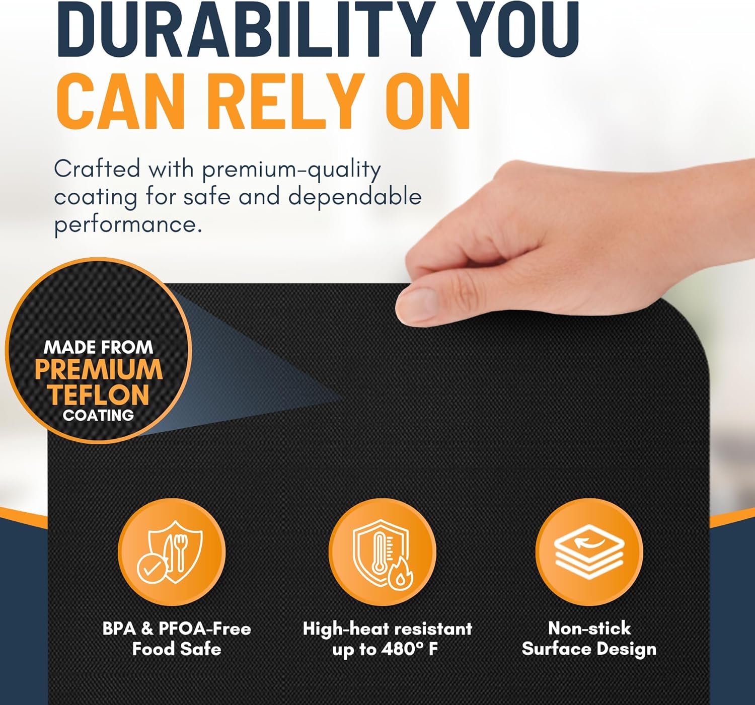 - PREMIUM QUALITY & SAFETY: Crafted from high-quality Teflon coating, our air fryer mat is BPA-free, PFOA-free, and heat resistant up to 480F. This ensures safe cooking without any harmful chemicals leaching into your food. Enjoy healthier meals with this durable, non-stick liner that stands up to high temperatures